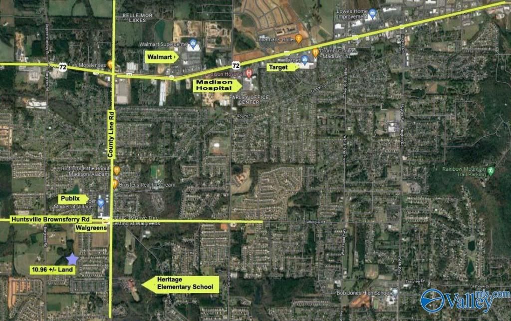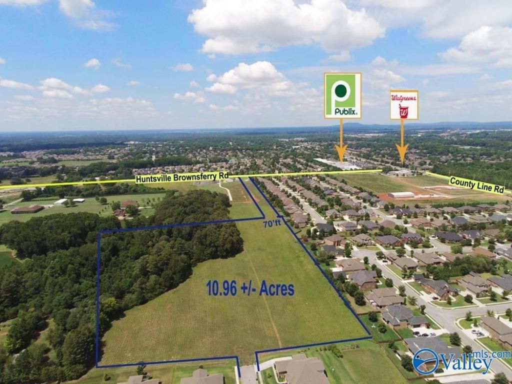 Beautiful 10.96 +/- acres, surrounded by successful Madison city neighborhoods on all sides, would make a great extension to a community or an estate. Land directly borders behind browns ferry crossing, accessible from Belmont place or bakers farm. 1/4 mile from the Publix shopping center on corner of county line rd. & browns ferry rd. Owner has deeded 70 feet easement beside church to connect browns ferry road, or easily accessible from bakers farm on Burgreen rd and Belmont Place on county line. Land can annex into Madison city.