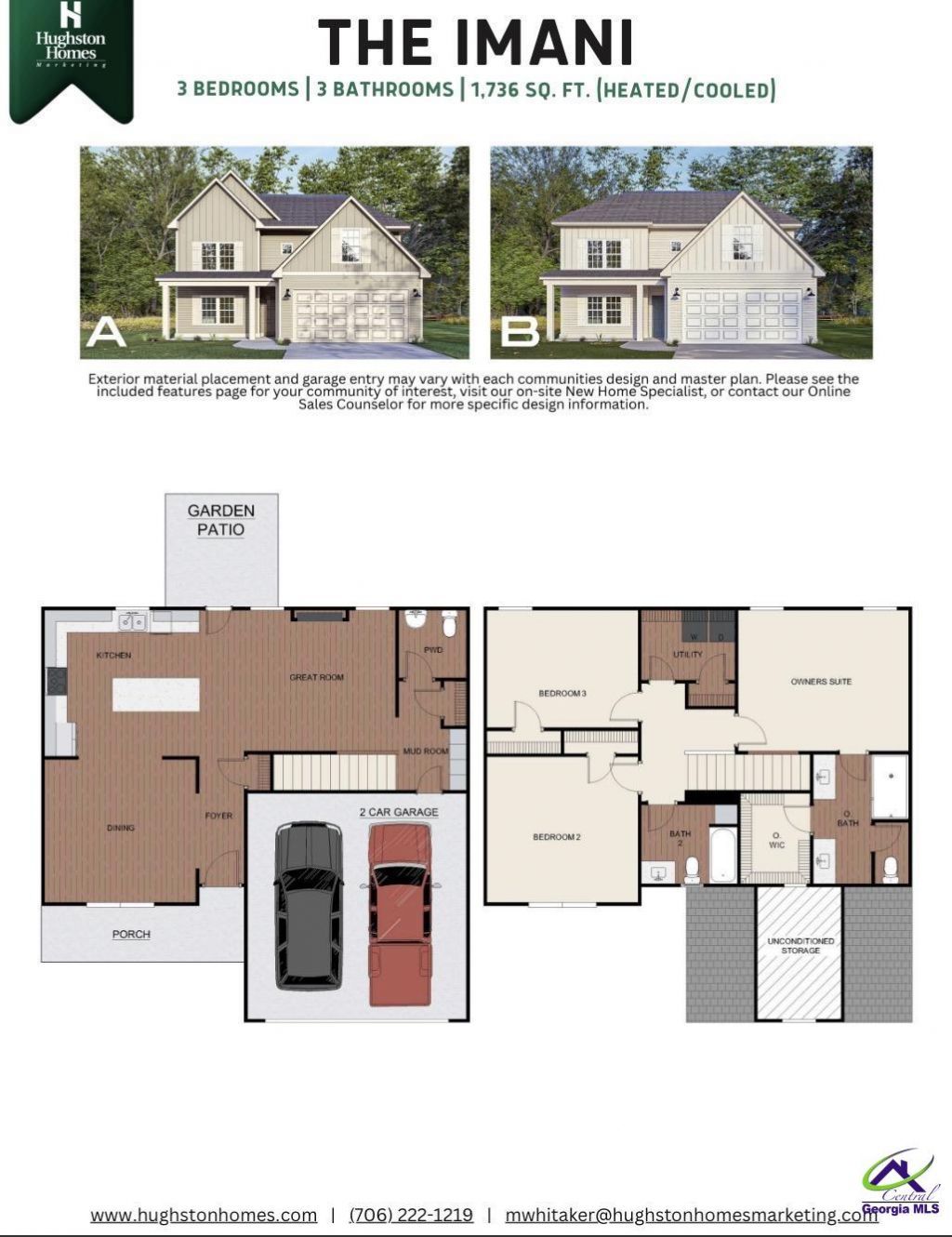 Clifton Ridge, a Hughston Homes Community, is centrally located in Jones County, Ga. Here is where style, space, and smart living come together! Meet our Imani A, floorplan, Offering 1,736 sq. ft. with 3 bedrooms and 2.5 baths, this design gives you all the room you need with a fresh, modern feel. Step inside to an inviting foyer that opens to a chic formal dining room with detailed trim, perfect for gatherings or everyday meals. The large center island anchors the kitchen, complete with granite, tile backsplash, stainless-steel appliances, and a seamless view into the spacious great room. Easy access to your Garden Patio makes indoor-outdoor living a breeze, and a tucked-away half bath keeps things convenient for guests. A built-in drop zone with cubbies greets you at the two-car garage entry, ideal for keeping bags, shoes, and life organized. Upstairs, the landing leads you to a full bath, laundry room, and two additional bedrooms with great closet space. Your owner's suite is a true retreat, featuring a tray ceiling, ceiling fan, and a private bath with double sinks and a roomy shower. The large walk-in closet includes attic access for extra unconditioned storage, perfect for seasonal items. Enjoy durable Luxury Vinyl Plank Flooring in the main living area of this home. Modern finishes, smart flow, and flexible spaces make the Imani A the standout choice for today's lifestyle. Fresh, functional, and ready for what's next! This plan makes coming home feel just right.