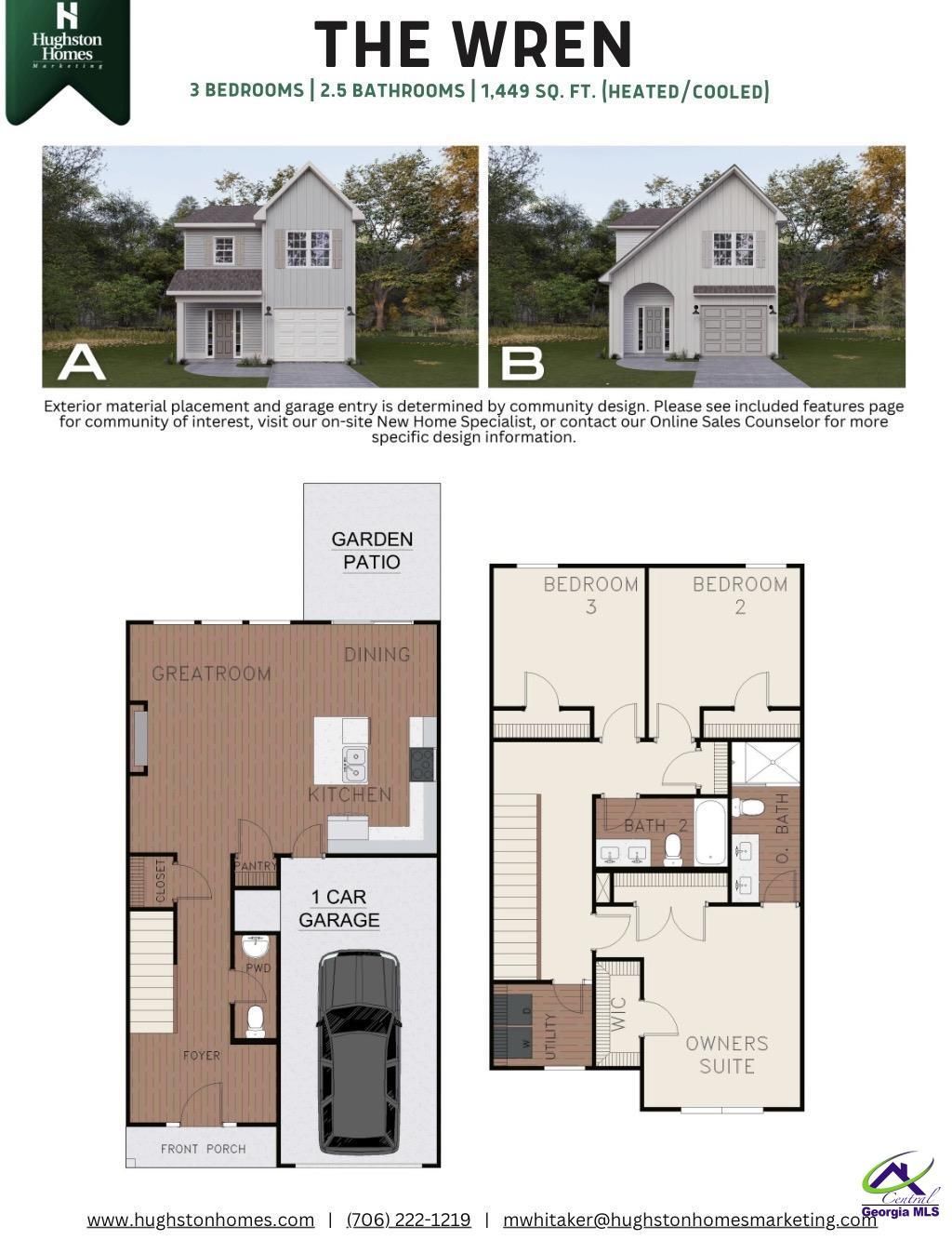 Clifton Ridge, a Hughston Homes community, is centrally located in Jones County, GA, where comfort, style, and smart design come together. Meet the Wren A, a thoughtfully designed 1,449 sq. ft. floorplan offering 3 bedrooms and 2.5 baths, perfectly sized for easy everyday living. Step inside to an open-concept layout where the Great Room with an electric fireplace flows seamlessly into the kitchen and dining area, creating a bright and welcoming space to relax or entertain. Just off the dining area, enjoy direct access to the Garden Patio, making indoor-outdoor living effortless. The kitchen is both functional and stylish, featuring modern finishes and a layout that keeps you connected to the heart of the home. Upstairs, you'll find two secondary bedrooms, a full bath, and a conveniently located laundry area. The owner's suite offers a peaceful retreat with a spacious bath and generous closet space, designed for comfort and simplicity. Additional highlights include a one-car garage, Luxury Vinyl Plank flooring in the main living areas, and an efficient layout that maximizes every square foot. With its smart flow, inviting spaces, and low-maintenance design, the Wren A is a wonderful option for those looking for modern living without excess. Fresh, functional, and perfectly sized, the Wren A makes coming home feel just right.