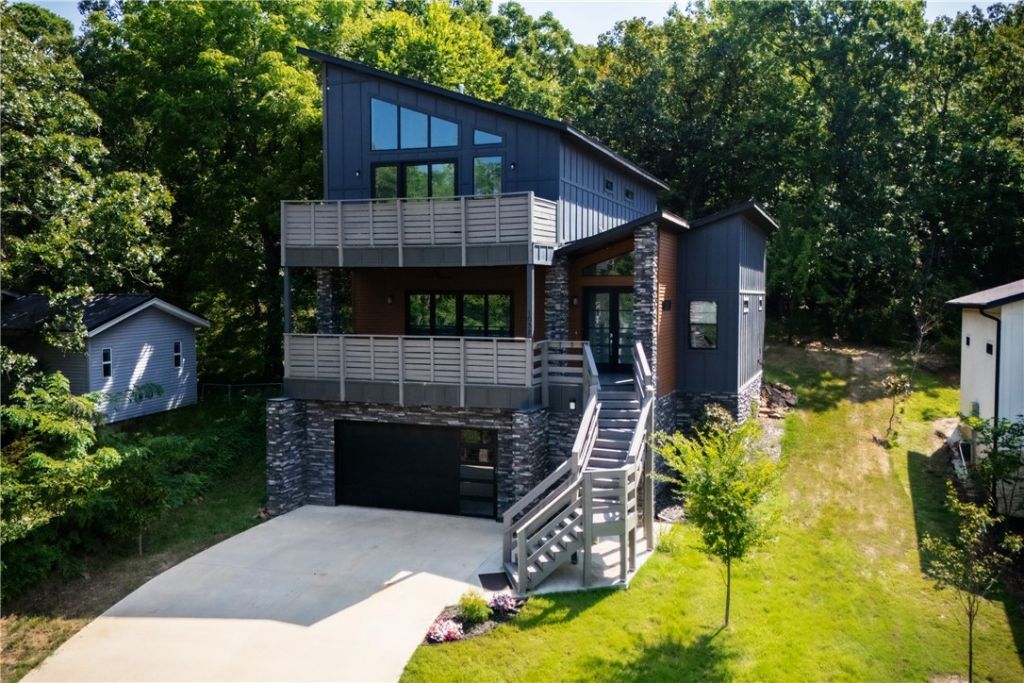 Stunning Hilltop Retreat with Breathtaking Views of Old Main. Perched at the top of a quiet hill near Root Elementary School, this exceptional Fayetteville residence offers panoramic views of Old Main and unforgettable sunsets from two expansive west-facing patios. Backing up to a serene wooded area filled with deer and native wildlife, this home provides unmatched privacy and a true connection to nature, all while being minutes from the heart of town. Thoughtfully designed with comfort and luxury in mind, the home features two spacious primary suites, each with a private bathroom boasting elegant tilework and freestanding soaking tubs. Modern hardwood floors, plentiful windows, and large sliding glass doors flood the home with natural light, while contemporary fixtures and premium KitchenAid stainless appliances add style and convenience.The fully finished walkout basement includes a bonus room and a media space. Walking distance to Lake Lucille!