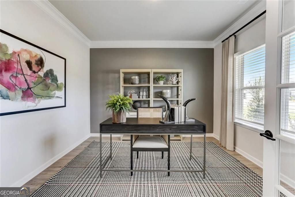 Move-in ready in June! The McGinnis plan, built by Smith Douglas Homes, is located in the new Laurel Creek community and offers a spacious, functional layout with modern upgrades throughout. A welcoming foyer opens to a traditional floor plan that includes a separate study - perfect for a home office or flex space. The heart of the home is the open-concept island kitchen, designed for both everyday living and entertaining. Featuring stainless steel appliances, gleaming granite countertops, a designer tile backsplash, upgraded cabinetry with crown molding, stylish pendant lighting, and a spacious center island, this kitchen is as beautiful as it is practical. The kitchen flows seamlessly into the bright and airy family room, where a contemporary linear fireplace creates a cozy focal point. Additional windows flood the space with natural light, while direct access to the rear patio makes indoor-outdoor living effortless. Durable and stylish luxury vinyl plank flooring extends throughout the main level, enhancing both beauty and functionality. Upstairs, an elegant open staircase with iron railings leads to a versatile loft space-perfect for a media room, play area, or secondary workspace. The expansive primary suite serves as a relaxing retreat, featuring a large walk-in shower and an impressive walk-in closet with direct access to the laundry room for added convenience. Three generously sized secondary bedrooms provide ample space for family or guests and share a well-appointed hall bath. Throughout the home, 9-foot ceilings enhance the open, airy feel and add to the overall sense of luxury. Located in the sought-after Laurel Creek community, residents will soon enjoy resort-style amenities, including a swimming pool and cabana-ideal for relaxing weekends or socializing with neighbors. With its move-in ready timeline, modern finishes, flexible living spaces, and community-focused lifestyle, this home presents an exceptional opportunity for buyers seeking comfort, style, and convenience all in one place. Photos are representative of the floor plan and not the actual home. Seller incentives with use of preferred lender.