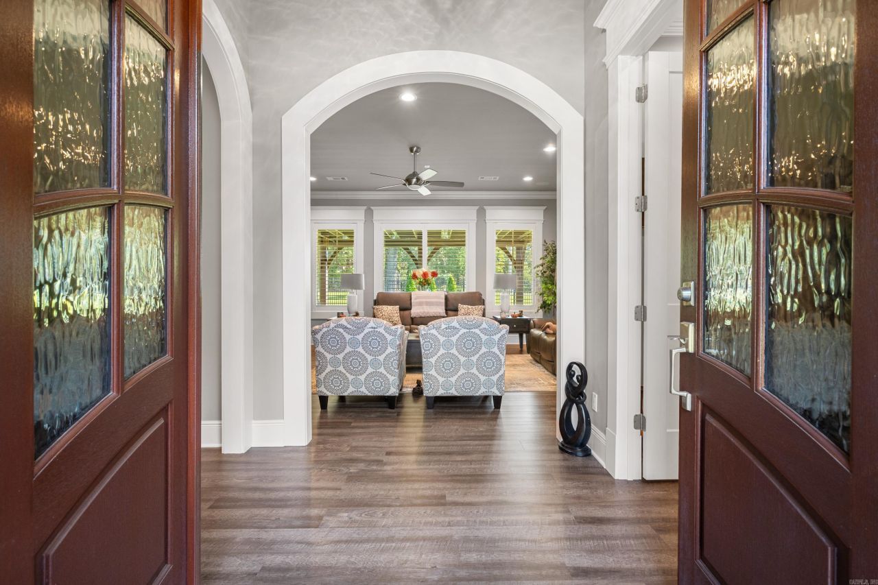 If you are looking for timeless design and exceptional quality, this beautiful home in the desirable Arlington Park subdivision is the perfect choice. Gated for your security and comfort, and just steps away from the Hot Springs Country Club, you'll fall in love with the attention to detail throughout. The spacious living/dining room area is just off the kitchen that features textured quartz countertops, stainless appliances and a large, walk-in pantry. The laundry room has a closet and ample storage. There is a home office with built in shelves and a door for privacy. The bedroom accommodations are impressive, particularly the master suite with two walk-in closets. The master bath has a walk-in shower and gorgeous tub. Surround sound in the main living area and the open concept will make entertaining a breeze. Relax in the sunroom or outside on the pergola-covered patio or the separate screened-in porch. This beautiful home is situated on 2+ lots that boasts a manicured lawn. The three-car garage has air conditioning/heat and includes a safe/storm room and whole-home generator. The attic above the garage was designed to be a potential bonus or bedroom. This is a must see!