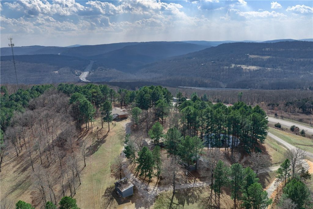 Scenic estate on 21 acres in Winslow. Unique opportunity at one of the highest elevations in Washington County, at 1920 ft. above sea level. Spring-fed pond accentuates the beauty of the well-maintained acreage. Spacious 2-story home is ready for your special touch with panoramic views from every window. Large kitchen with pantry, oversized primary suite with 3 closets, 3 additional bedrooms, 3 full bathrooms, living room, family room and bonus room. New roof, inviting brick fireplace and covered porches add to the features. Multi-bay barn with tack rooms, hay loft and gables plus a shop with concrete floor and storage shed. Convenient location off I49, only 10 minutes to Devil's Den State Park, 20 minutes to Fayetteville and 30 minutes to Ft. Smith. Recreation, commercial and development potential. No deed restrictions. Appointment only. Being sold AS-IS.
