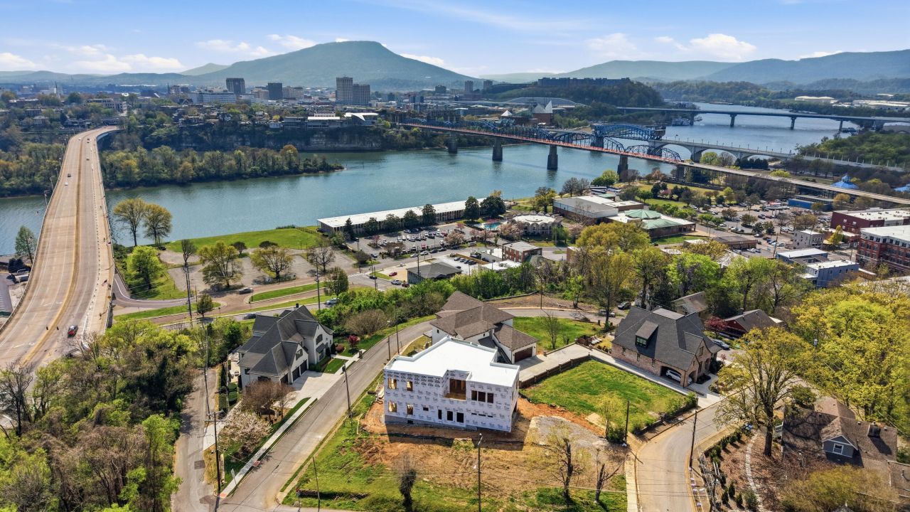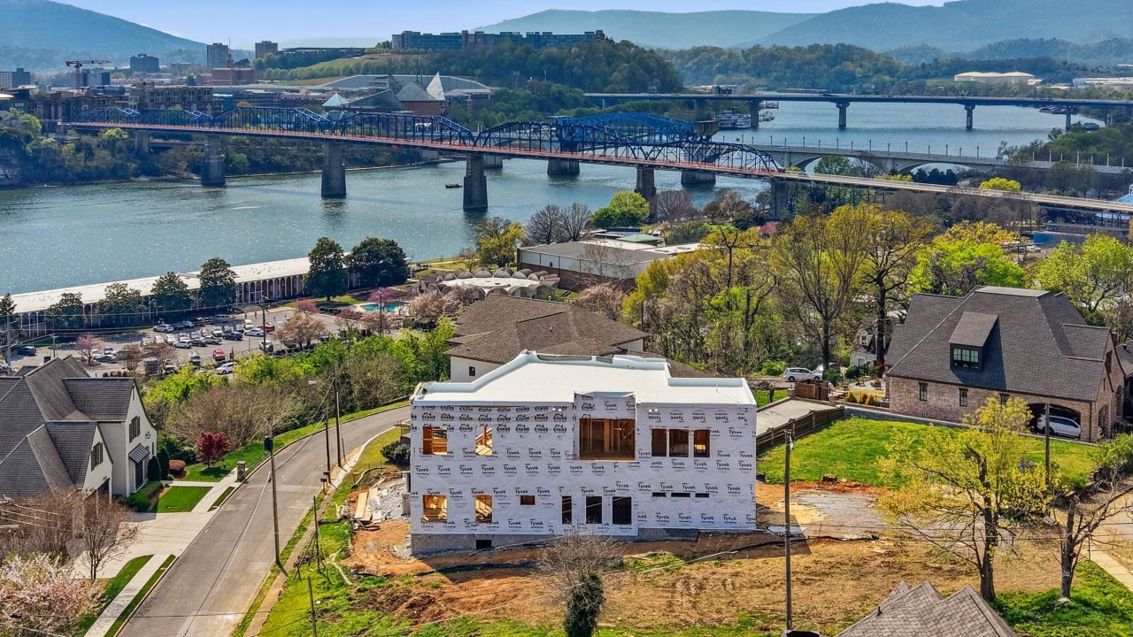 119 Baker Street presents a rare opportunity to own a striking modern home currently taking shape in one of North Chattanooga's most scenic settings. Designed to capture sweeping views of downtown Chattanooga and the Tennessee River, this thoughtfully planned residence offers approximately 5,000 square feet, four bedrooms, four full bathrooms with en suites, and two half bathrooms, creating a layout that feels both refined and incredibly livable. Clean modern lines are complemented by a timeless exterior of brick and rich wood accents, giving the home both warmth and architectural presence.The first floor is anchored by a comfortable family room and includes three bedrooms, highlighted by a private primary suite. Two additional bedrooms, a laundry room, a powder room, a mud room, and access to the two-car garage are thoughtfully arranged for ease in everyday living.Upstairs, the home opens into an impressive entertaining level where 12-foot ceilings elevate the living room, dining area, and kitchen, creating a sense of volume and light while framing remarkable views. A gas fireplace anchors the living space, adding warmth and atmosphere. The kitchen is designed with both beauty and performance in mind, featuring a 42-inch range, double dishwashers, a 60-inch refrigerator and freezer, an expansive 17-foot island, and a walk-in pantry, creating a true chef's kitchen experience. Windows and doors by Win-Gate further enhance the home's design, bringing in natural light while maintaining clean, modern lines.Outdoor living is equally considered, with a covered front porch on the main level and an open upper sun deck connected to the main living areas, offering an ideal setting for hosting and gathering while taking in front row perspectives of the Bluff View Art District, Veterans Bridge, downtown skyline, and the river below. This level also includes a dedicated office, a guest suite with a private bath, a powder room, and a storage area housing mechanical systems. Each bedroom is designed with its own en suite and walk-in closet, providing comfort and privacy for both residents and guests. The overall design balances clean, modern lines with intentional functionality, creating a home that will feel as good to live in as it looks. A tankless water heater and TPO roofing system add thoughtful efficiency, with the roofing designed to help reflect heat during the warmer months, an especially valuable feature for Southern summers.While the project is still in the construction phase, there is a limited window for buyers to collaborate on select finishes, offering the opportunity to personalize key design elements and bring their vision to life. Set on a centrally located lot overlooking the city, mountains, and riverfront, the property is just moments from North Shore shopping and dining, parks, schools, hospitals, and the Chattanooga Golf and Country Club. Estimated completion is late summer. Property is currently an active construction site.