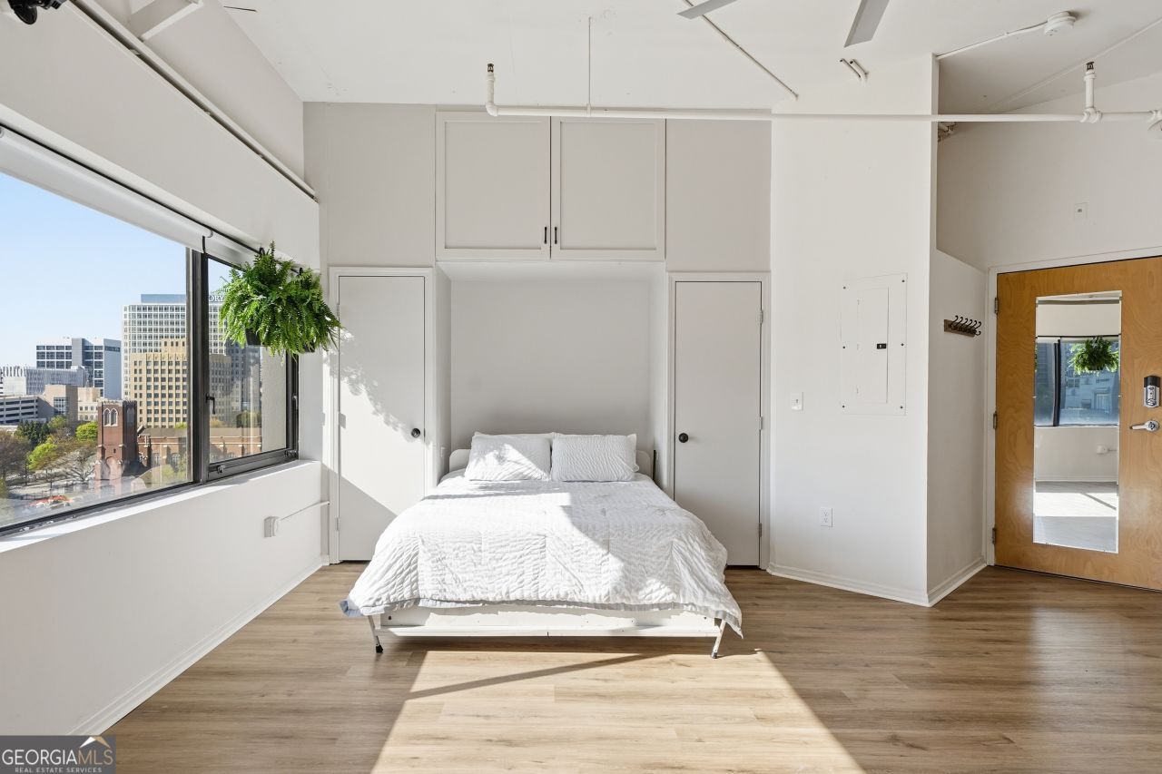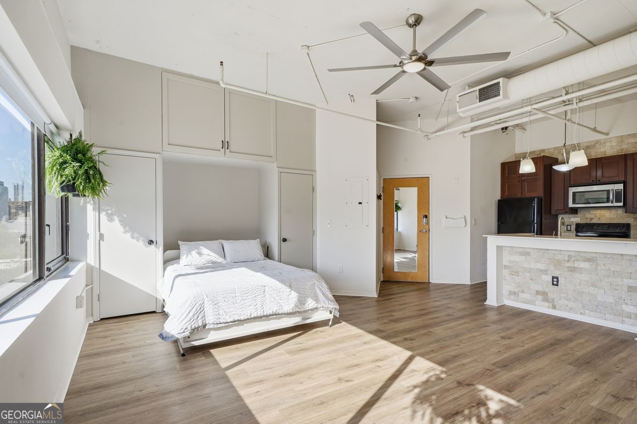 Perched on the 9th floor, this loft delivers sweeping panoramic views of the Atlanta skyline through a full wall of windows, creating a living experience that feels open, elevated, and connected to the city, including direct views of fireworks during major events. 11 ft ceilings and a custom Murphy bed create a flexible layout that transitions easily between living and sleeping. The kitchen features stone countertops and a farm-style sink with a clean, modern finish. Full-service building with 24-hour concierge, pool, fitness center, business center, gated access, and deeded covered parking. FHA-approved. Positioned between Midtown, Old Fourth Ward, and Downtown, with the BeltLine, Ponce City Market, Krog Street Market, and Georgia State all within minutes. MARTA access is just steps away. The Stitch, a planned park and connectivity project, is expected to be located just outside your door. With major city events ahead, this is a strong opportunity to secure a well-positioned residence in the center of it all. Ask about available lender incentive.