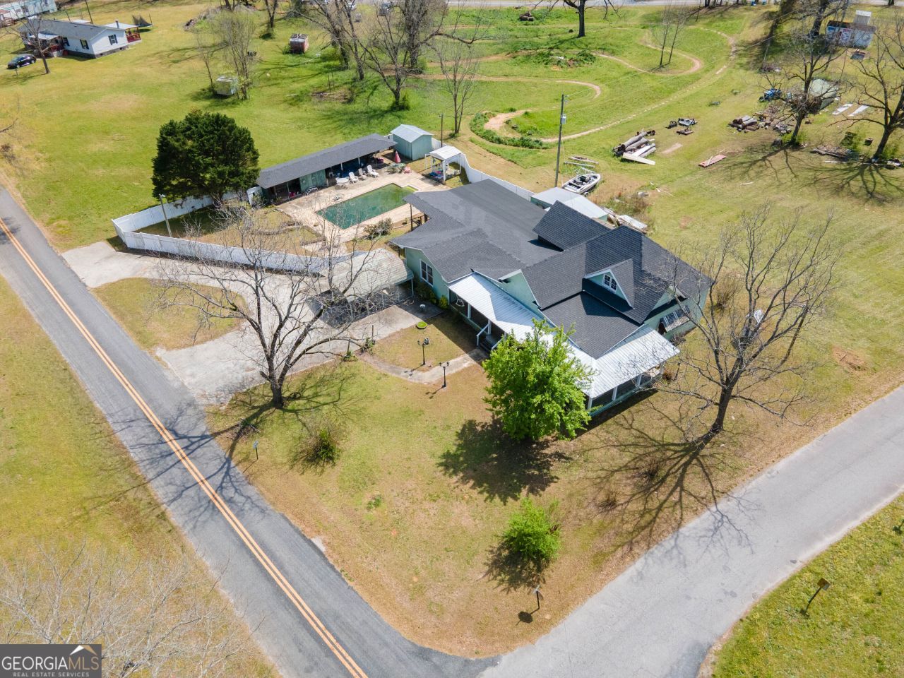 Nestled on the corner of a quiet country street, this charming farmhouse offers timeless character, generous space, and incredible potential, all while qualifying for 100% financing for eligible buyers. Lovingly maintained over the years, this home is full of warmth and classic Southern appeal. Featuring two spacious bedrooms on the main level, both with primary suite potential, there is also the opportunity to create a third bedroom if desired. The home welcomes you with a formal dining room and inviting entry area, perfect for gatherings and everyday living. A bright and airy sunroom, lined with windows, provides the ideal space to relax and enjoy peaceful views year-round. Step outside to a beautiful rocking chair front porch or entertain on the large covered back deck overlooking your private in-ground pool area, ready to shine again with just a little care. Inside, you'll find original hardwood floors, an open kitchen with abundant cabinet space, and an impressive amount of storage throughout. Upstairs, a loft area offers the potential to be finished into two additional rooms, adding even more living space and value. With its blend of historic charm, flexible layout, and room to grow, this home truly embodies Southern living at its finest.