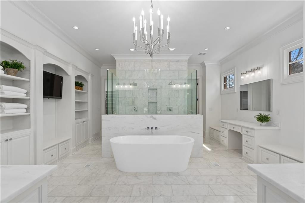 Beautiful home located in a secluded cul-de-sac within the gated Manor Golf and Country Club, this Santoro Custom Homes resale is immaculate. The double entry doors with gas lanterns open to a two-story Foyer with a large Dining Room on one side and a warm wood Study with double glass french doors and fireplace on the other side. The light-filled two-story Great Room has bookcases, fireplace, and opens out to a covered porch and luxurious backyard. Spacious Kitchen includes granite counters, custom cabinetry, walk-in pantry, wine refrigerator, Wolf/Subzero Appliances, vegetable sink, island, breakfast bar, built-in spice racks, back door to dedicated grilling porch, and large breakfast room with computer desk. Vaulted Keeping Room with stone fireplace has beautiful view of backyard. Private, Main Level Owners Suite overlooks yard and pool and has a luxurious bathroom with double shower, soaking tub, double vanities, shelving and TV space, and walk-in closet with built-ins. Powder Room, mud room, and large laundry room complete the main floor. Upper level features a cedar closet and four additional bedroom suites - each with an en-suite bathroom and walk-in closet. One of the bedrooms features a large sitting room/playroom. The finished terrace level is perfect for entertaining and is complete with a family room with stone fireplace, game room, brick wine cellar with iron door, powder bathroom, theater room, billiards room with pub shelf and designer brick wall, full bar with wine refrigerator, dishwasher, microwave, ice machine and warming drawer. A full bedroom suite with large walk-in closet and private bathroom are also located in the terrace level. Plenty of unfinished space for storage. Terrace level walks out to covered patio and salt water pool with hot tub and landscaped waterfall, arbor, outdoor fireplace, and mature landscaping. Four car garage and motorcourt. Side porch. Fenced backyard. Alarm System. Gated community with unparalleled amenities including indoor & outdoor pools, indoor & outdoor tennis courts, two Clubhouses, fitness center, sidewalks throughout and an 18-hole Tom Watson designed golf course. Great Schools. Close to shopping and restaurants. Easy access to GA 400.
