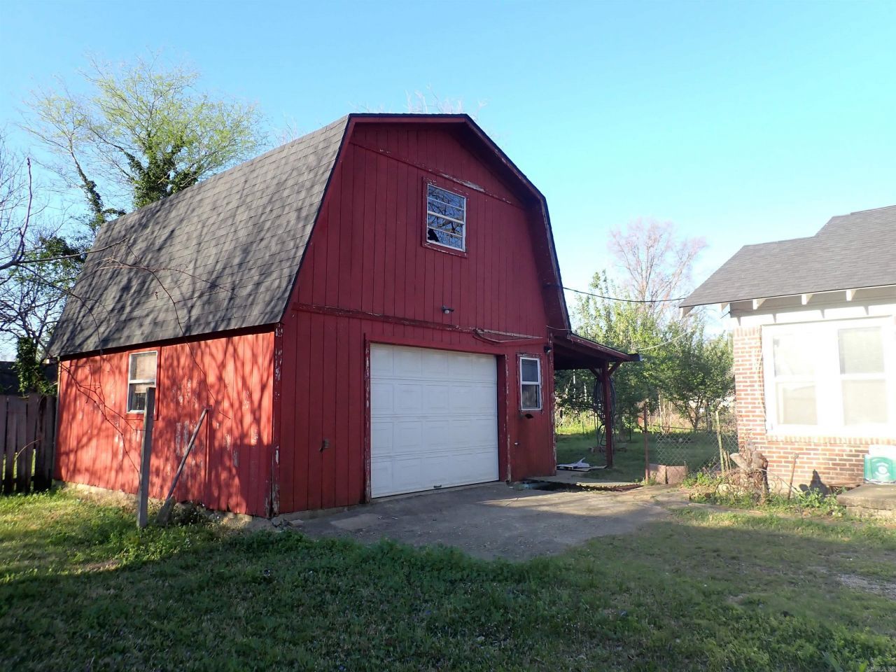 ONE-STORY, Dark RED BRICK HOME with painted white trim (frame), MISSION STYLE from the mid-1930's with front porch -and- a DETACHED, 2-Level, Barn- shaped, GARAGE/SHOP (20' x 22') w/stairway to 'room above'. Plus, this Property has a nice-sized BACK YARD that has been a 'garden area' for years! The interior of this home has 9' tall ceilings, mostly. The floor plan features a LIVING room, DINING room, a big KITCHEN with stainless appliances (NEWER Refrigerator/Freezer, a natural gas Range, & sink, and enclosed back porch with LAUNDRY CONNECTIONS, 3 BEDROOMS and 2 BATHROOMS. The square footage IS JUST RIGHT --- at 1,386 heated/cooled! Gas space heat/window air conditioners. This home has BRAND NEW SHINGLES on the roof! Some repair is needed in different areas of the house (inside and outside). THAT IS WHY THE PRICE IS ONLY $89,500.00. Come and see 'what you think'. New on the market!