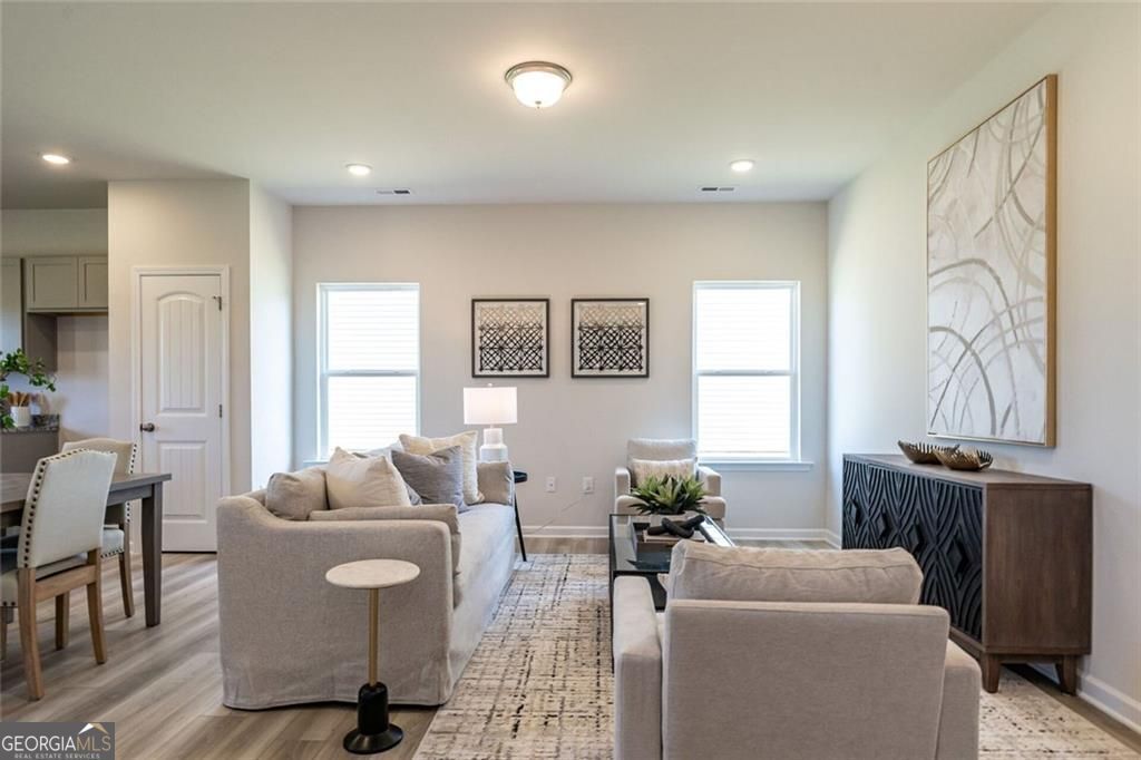 Move-In Ready April 2026! The Manchester II, a new construction home by Smith Douglas Homes in The Andros community. This beautifully designed home perfectly blends style, comfort, and functionality; offering modern finishes, open-concept living, and designer upgrades throughout-ideal for those seeking both elegance and everyday convenience. The main level features a bright and spacious open kitchen, dining, and living room combination, creating the perfect space for entertaining and daily living. The gourmet kitchen showcases granite countertops, a large center island, upgraded cabinetry with 42 upper cabinets, stainless steel appliances, and ample storage, making meal prep and hosting effortless. Durable and stylish luxury vinyl plank flooring flows throughout the main living areas, providing a seamless, modern look. A stunning linear fireplace in the family room adds a contemporary focal point. Extra windows in the foyer and at the top of the stairs flood the home with natural light, enhancing the airy feel. Step outside to the covered patio, conveniently located just off the kitchen, offering easy indoor-outdoor living for grilling, relaxing, or entertaining guests. Upstairs, retreat to the spacious primary suite featuring a private sitting area, perfect for a reading nook or home office space. The primary ensuite bath includes a double-bowl vanity, compartmentalized layout for added privacy, and a large walk-in closet. Two generously sized secondary bedrooms, a full bath, and a conveniently located upstairs laundry room complete the second level, designed for maximum efficiency and comfort. Additional highlights include a stylish iron rail staircase on both the first and second floors, designer finishes, and smart use of space throughout. Seller incentives with use of preferred lender. Photos representative of plan not of home.