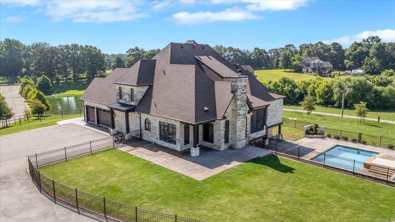 Welcome to Cypress Ranch, located at 136 County Road 107 in Jonesboro. This is an extraordinary gated luxury ranch estate offering 62.33 acres of privacy, natural beauty, and exceptional craftsmanship just minutes from Jonesboro, Arkansas. This remarkable property features a custom built 7,350 square foot residence with 4 bedrooms and 4.5 bathrooms, thoughtfully designed for comfort, security, and refined ranch living. Inside the home, you will find extensive cedar woodwork, spacious living areas, and a gas and wood burning fireplace that creates a warm and inviting atmosphere. The fully finished basement provides additional living and entertainment space, while two large reinforced safe rooms offer peace of mind and security. The home is also equipped with a full home generator, smart home security system, and a new roof installed in 2025, ensuring reliability and modern convenience. Step outside to experience resort style amenities, including a heated and cooled saltwater pool, hot tub, and beautifully maintained grounds overlooking a fully stocked front pond. The outdoor spaces are ideal for relaxing, entertaining, or simply enjoying the quiet surroundings and scenic views.