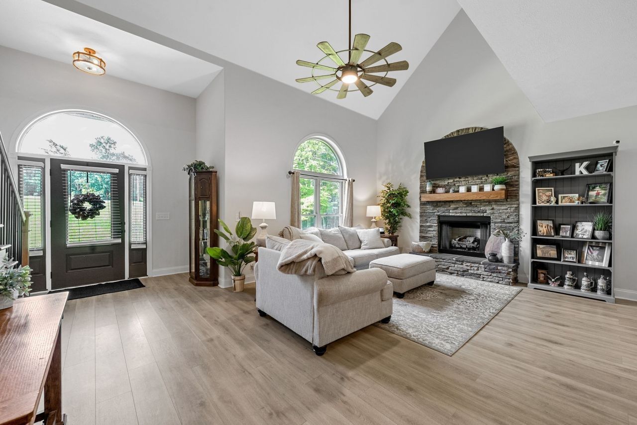 Country living at its finest! Only 20-25 mins from Downtown Clarksville! NO HOA! NO CITY TAXES! Motivated sellers! *SELLER TO PROVIDE $30,000 IN CONCESSIONS!* + $6,947 LENDER CREDIT! This luxury estate boasts 2.74 acres, a detached garage, covered patio, chickens + chicken coop, and a gated path leading to your private creek. Inside, the main living area features vaulted ceilings, stone fireplace, handcrafted floors, and stairwell lighting. The eat-in kitchen boasts custom cabinetry, quartz countertops, and a pantry! Downstairs primary suite offers a walk-in closet with an en suite bathroom, double vanities, linen closet, and a custom tiled shower. Upstairs you'll find 2 oversized bedrooms with large closets PLUS a 2nd primary suite w/ huge walk-in closet and full en suite bathroom. Two additional linen closets upstairs! MASSIVE bonus room for fifth bedroom, office, or movie room. All ceiling fans are on a remote control. Preferred Lender is offering a credit up to $6,947 towards closing costs or permanent rate buydown. Flood insurance not required. The pond has never flooded, there is a runoff in the back to catch any overflow and direct it to creek.