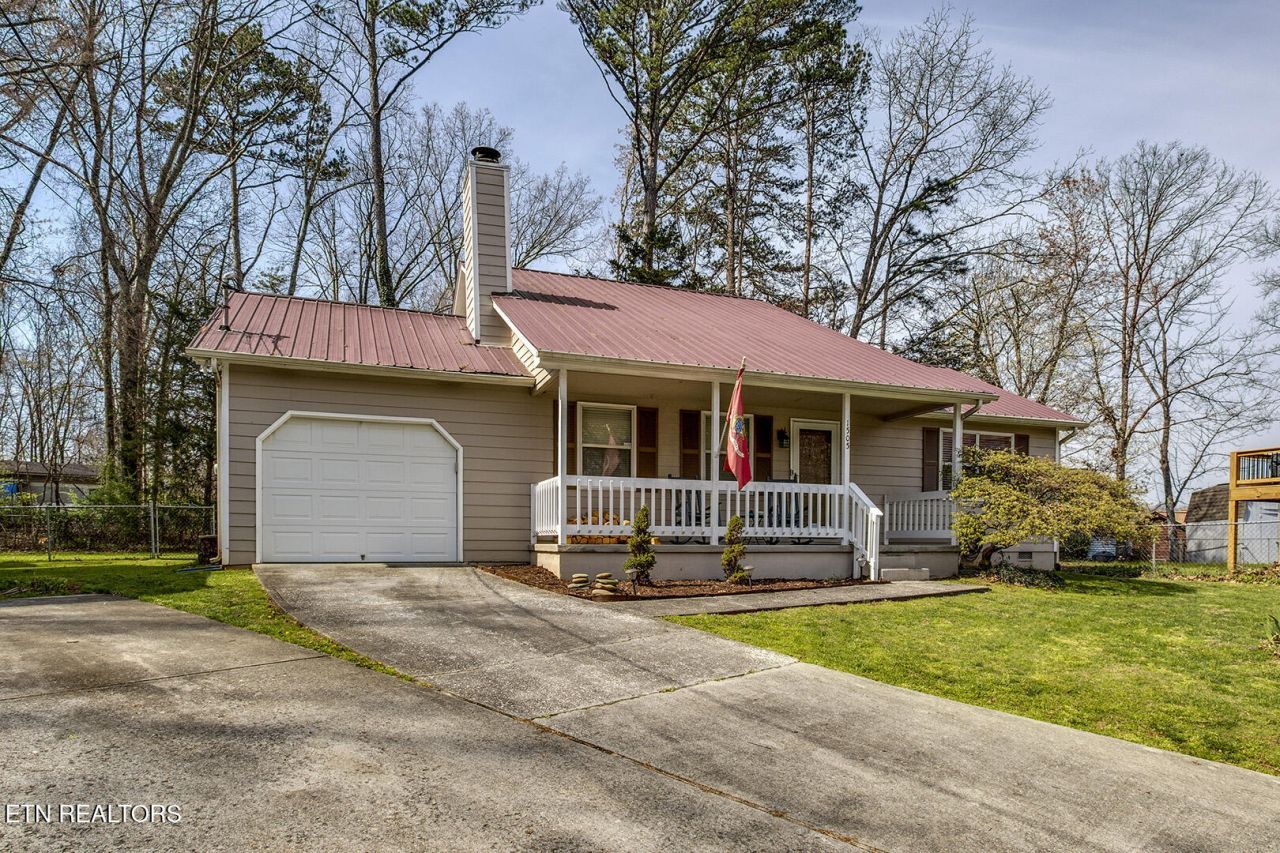 Great Price! Adorable Updated home in the heart of West Knoxville. Quiet Cul-de-sac location. Charming covered front porch. Fully fenced backyard. Cathedral ceilings with two story wood burning stone fireplace, 3 bedrooms and 2 full baths. Eat in Kitchen with granite counters, appliances convey. Oversized deck and single car garage. Long lasting Metal Roof! Truly move in ready! Come and Look!