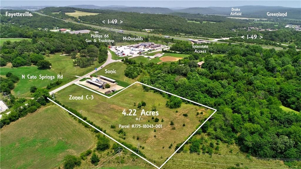 Fayetteville is expanding south into Greenland, and this 4.22 acres of prime commercially zoned property is ready to play a part. The region is exciting and growing and any number of enterprises can thrive on this land just off Interstate 49, including a wide range of commercial uses concerned with retail trade and consumer services; amusement and entertainment establishments; automotive and vehicular service establishments; transient sleeping accommodations; drive-in stores; eating and drinking places; financial institutions; and offices. Rolling green hills provide a picturesque setting, with nearby residential neighborhoods and Kessler Mountain Regional Park. With just quick drive up the I-49 to all that Fayetteville has to offer, this commercial land opportunity is golden!