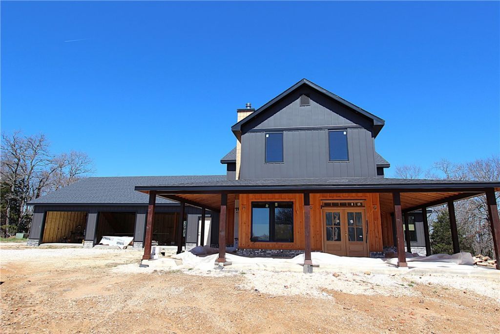 New Construction on 11.28 acres not far off of I-49 at West Fork. This modern country home is built well and much more like a custom home than your typical spec. Over 6000 sqft under roof including a large wraparound porch, approx 40x 50 garage that's heated/cooled with its own min-split and a huge storage room upstairs. This energy efficient home has foamed walls and roof deck so everything inside is conditioned. Primary suite is downstairs with 2 large closets and one opens to the utility room. Living room has tons of windows for natural light, a wood burning fireplace and over 20' ceilings. 3 bedrooms, 2 baths plus a living space upstairs. Property also features a metal shop building (24x30) and a small horse barn. Hurry to pick your interior colors. Hill going up to the house on the driveway will be paved.