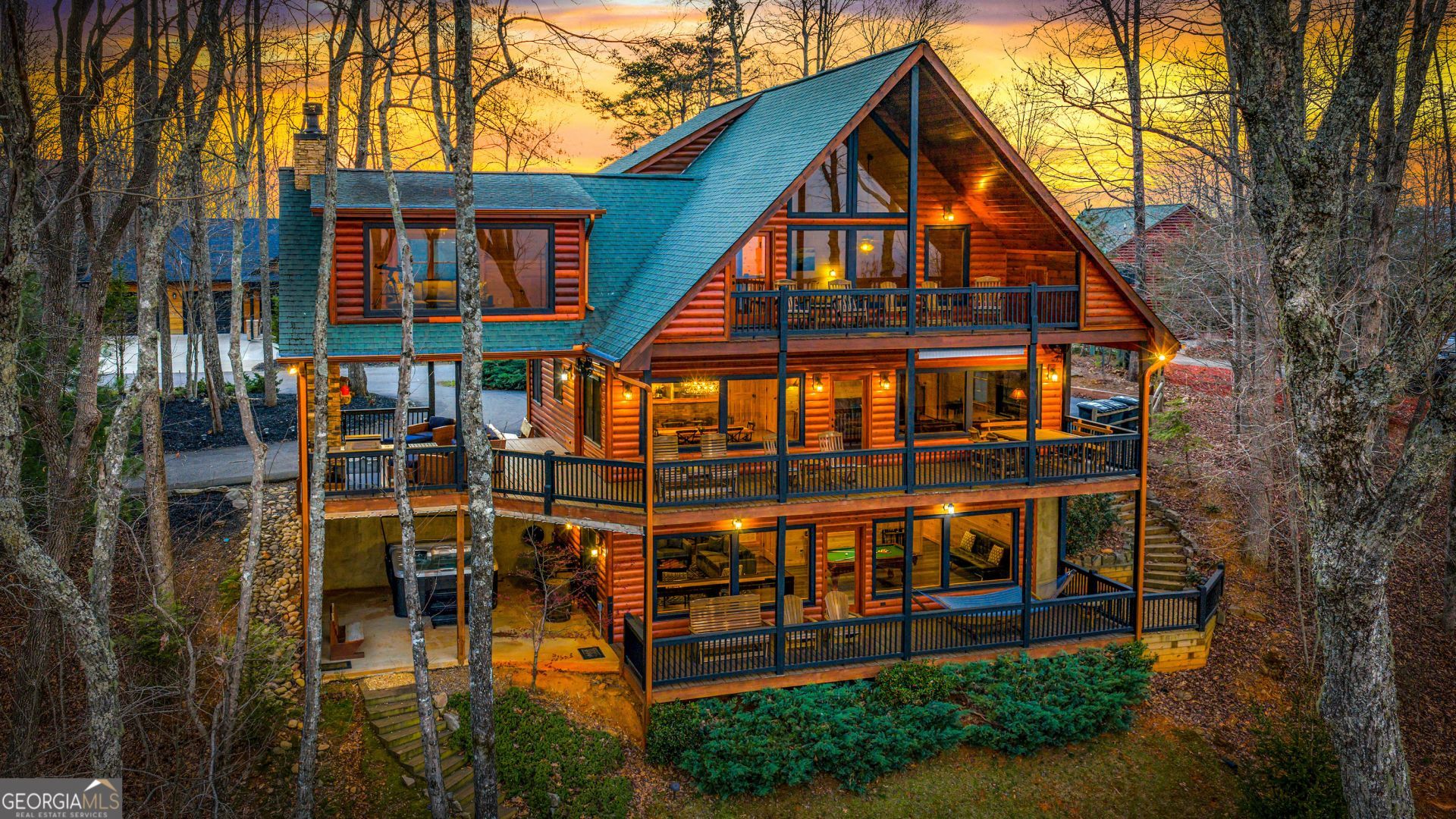 Perched to capture breathtaking long-range mountain views, this inviting 3-bedroom, 3.5-bath cabin blends comfort, style, and adventure into one unforgettable retreat. The main level welcomes you with a stunning great room featuring a dramatic wall of windows, rich hardwood floors, and a cozy gas log fireplace-perfect for soaking in the scenery year-round. The open dining area flows seamlessly into a spacious kitchen complete with upgraded cabinetry, new stainless steel appliances, granite countertops, and a convenient breakfast bar. The primary suite on this level offers a true escape, with a spa-like bath featuring a tile shower, luxurious soaking tub, and double vanities. Upstairs, you'll find a charming second sitting area that opens to a large private balcony-an ideal spot for morning coffee or sunset views-along with two comfortable guest bedrooms and a full bath. The terrace level is made for entertaining, offering a game and media space with an additional gas log fireplace, wet bar, and multiple areas to relax and unwind. Step outside and experience true mountain living with expansive deck space, a wood-burning fireplace, hot tub, and fire pit-all designed to enjoy the fresh mountain air and stunning surroundings. Located just a short drive to Blue Ridge for dining, shopping, and endless outdoor adventures, this cabin also offers all paved access and is already a successful rental property-making it the perfect investment or personal getaway. Whether you're unwinding under the stars, gathering around the fire with friends, or enjoying a quiet morning with mountain views as your backdrop, this cabin delivers the ultimate North Georgia experience. With its ideal blend of rustic charm and modern comfort, it's a place where memories are made and guests return again and again. This is mountain living at its best!