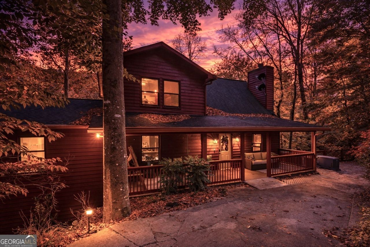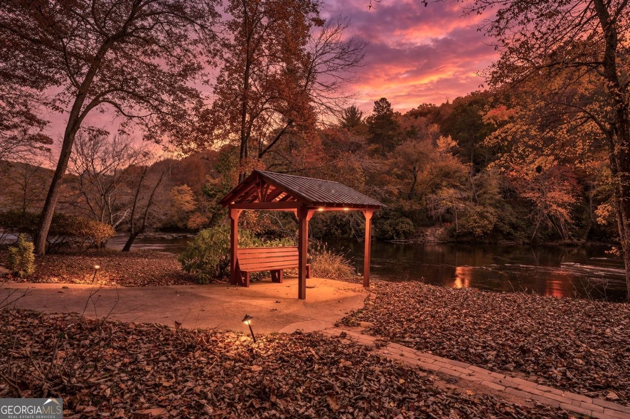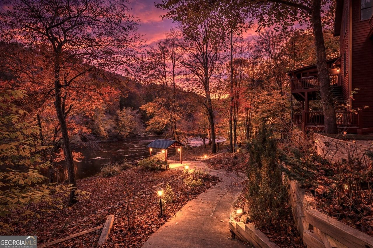 Tucked away on one of the widest spots of the musical Coosawattee River, this remarkable cabin is one you won't want to miss. The welcoming front porch invites you to enjoy the peaceful setting as you step inside to the spacious great room, featuring vaulted ceilings, floor-to-ceiling stone gas fireplace, a stunning stained-glass window & plenty of room for gathering. The open layout flows into the dining area with French doors leading to the rear porch, while the kitchen shines as a true entertainer's dream with bar seating at the peninsula, abundant cabinetry & open shelving, stainless steel appliances & stylish vent hood. The main level master is a private haven, complete with its own sitting room, vaulted ceilings with wood beams & walls of windows framing river views. The ensuite bath has a custom-crafted dual vanity & beautifully tiled glass walk-in shower. Upstairs, a charming tree-post detail at the landing leads to 2 bedrooms (one with river views) & full bath with tub/shower combo. The terrace level adds even more living space, perfect for games, lounging & fun, plus the convenience of a half bath. Outdoor living takes center stage with a screened-in porch where you can relax while watching falling leaves drift down the river, grill on the open deck, or soak in the hot tub on the lower porch. Take the path leading to a pavilion alongside the river perfect for those sunny, summer days & a paver firepit area to enjoy the chilly fall nights. Stone steps make access to the river a breeze. Located in a gated community brimming with amenities including 3 pools (one Olympic-sized indoor), rec center with fitness & game rooms, riverside parks, fishing pond, tennis/pickleball courts & year-round activities. All this, just a short drive from shopping, dining & outdoor adventures. Currently a highly successful vacation rental & offered turn-key, this is your opportunity to embrace the beauty of riverfront living or to secure an income-producing getaway.