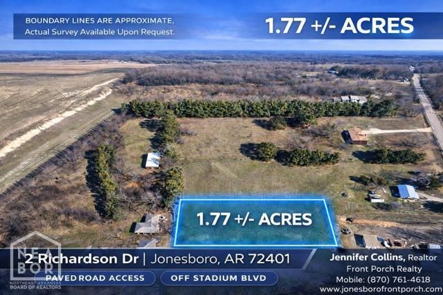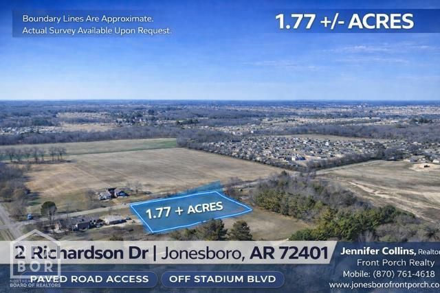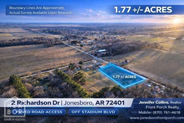 1.77 Acres of Buildable Land for Sale in Jonesboro, AR - Inside City Limits Rare opportunity to purchase 1.77 acres of flat, buildable land located inside the Jonesboro city limits at 2 Richardson Dr, Jonesboro, AR 72404. In-city acreage with usable space like this is becoming increasingly limited, especially in established growth corridors near Richardson Drive and Limestone Drive. This property features level topography, road frontage, and nearby availability of CWL utilities including electric, water, and sewer (buyer to verify connection requirements). The site offers excellent potential for custom home construction, barndominium builds, residential development, or long-term land investment. Conveniently located just minutes from Parker Road, Stadium Boulevard, and Interstate 555, the property provides quick access to NEA Baptist Hospital, shopping, dining, schools, and major commuter routes, making it attractive for both homeowners and investors seeking buildable land in Jonesboro, Arkansas. The parcel is situated in FEMA Flood Zone A, and future development may be possible subject to zoning regulations, engineering requirements, elevation standards, and city approvals. Buyers searching for land for sale in Jonesboro AR, acreage inside city limits, buildable residential land near I-555, or development property in Northeast Arkansas will recognize the value of securing property in this path-of-growth area while inventory remains limited. With its flat terrain, convenient location, and flexible residential potential, this property may suit a variety of uses including custom estate homes, barndominium construction, workshop-style homes, or future residential development (subject to zoning and city approval). Property to be verified by buyer regarding utilities, zoning, flood status, and permitted uses.