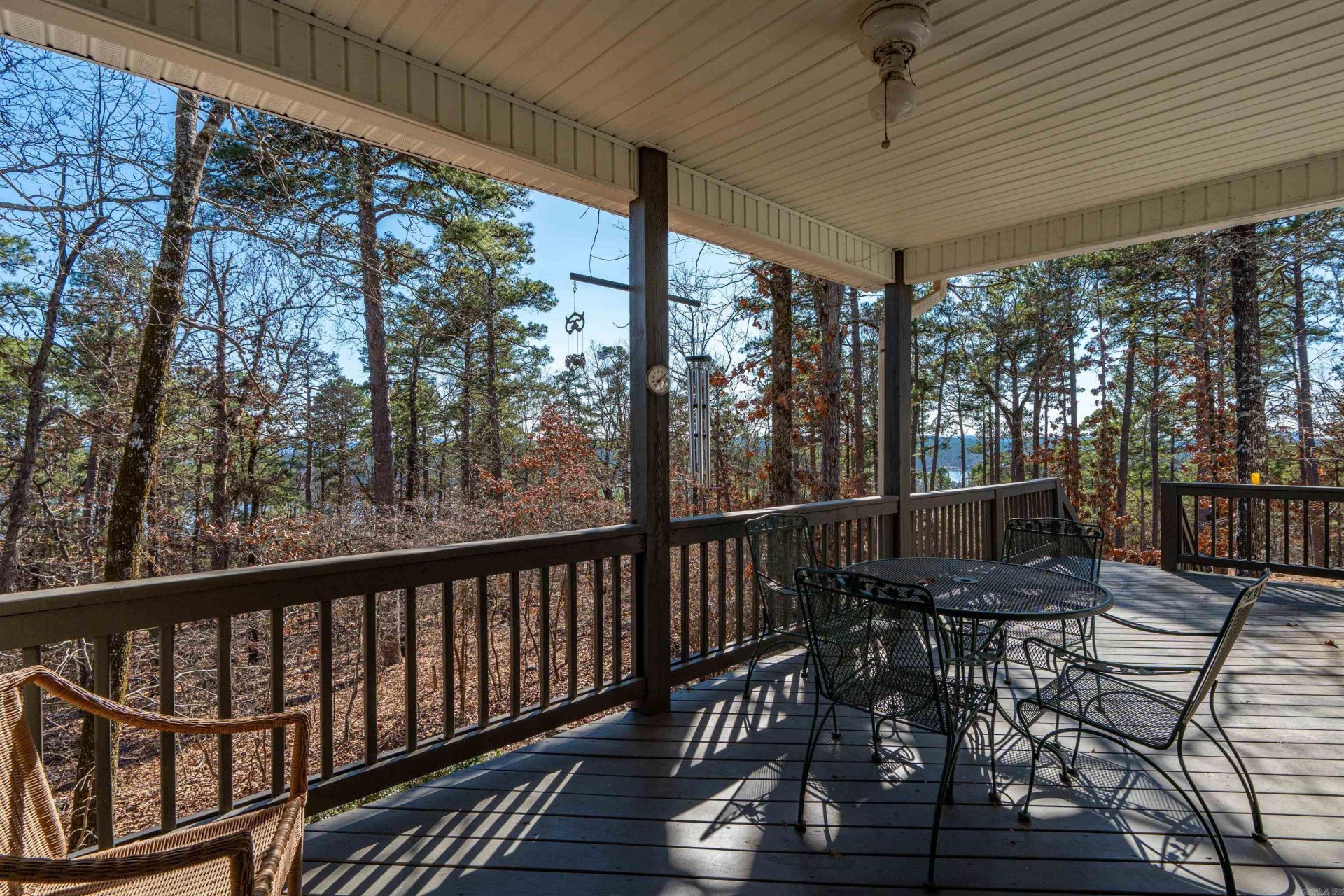Enjoy winter mountain and lake views in this well-maintained home in Hot Springs Village, a premier golf and lake community near Lake Coronado. Centrally located for convenient access to golf courses, lakes, walking trails, fitness centers, and pickleball, this property is ideal for retirement living or a full-time residence. This 3-bedroom home features an open concept floor plan with volume ceilings and a dedicated office space just off the kitchen, offering convenience and flexibility for work or hobbies. The kitchen includes an extra-spacious pantry and flows seamlessly into the main living and dining areas, perfect for everyday living and entertaining. The oversized primary suite offers a comfortable sitting area, along with a spacious bath featuring a separate tub and shower and a generous closet. A full utility laundry room with cabinets, sink, and space for an additional refrigerator adds everyday practicality. Enjoy both covered and open back decks for relaxing and taking in seasonal mountain and lake views. A workshop space below the home provides excellent storage or hobby space. Level driveway and low-maintenance lot complete this inviting property.