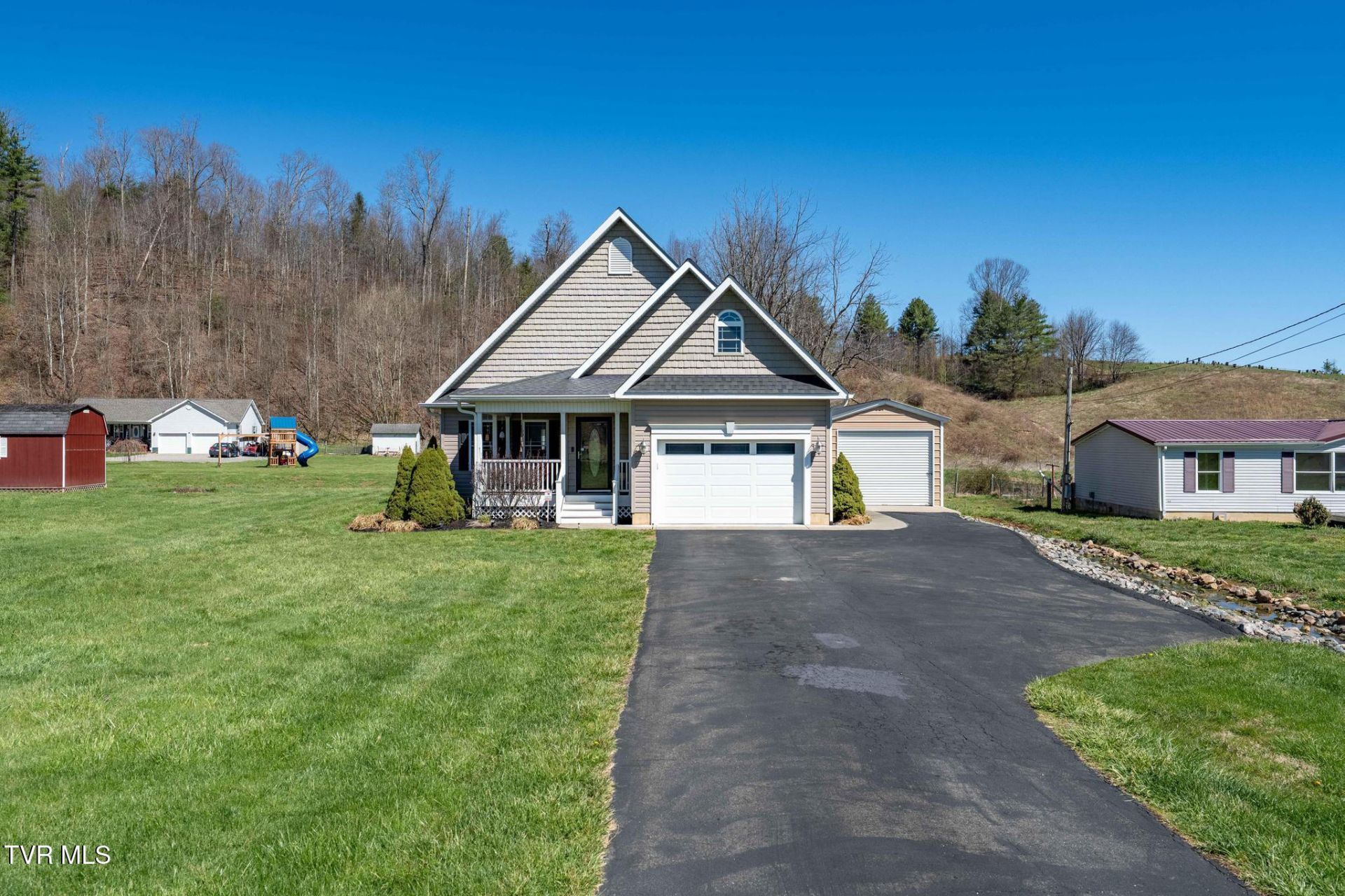 CHARMING CREEKSIDE CAPE COD HOME!! Nestled on a beautifully landscaped .32-acre lot at the base of the iconic ''The Snake'' leading up to Shady Valley, this inviting Cape Cod-style home offers the perfect blend of charm, comfort, and convenience. A paved driveway leads you to both an attached garage and an additional detached garage, providing ample space for vehicles, hobbies, or storage. The welcoming covered front porch sets the stage for relaxed country living, while inside you'll find durable wood-like tile flooring flowing throughout the home and a thoughtfully designed open floor plan ideal for everyday living and entertaining alike. The spacious living room serves as the heart of the home, highlighted by a stunning stone fireplace with gas logs that creates a warm and cozy atmosphere. It opens seamlessly into the dining area and a beautifully appointed kitchen featuring sleek black cabinetry, stainless steel appliances, and a peninsula bar with seating - perfect for casual meals or gathering with guests. Just off the main living area, a large screened-in back porch overlooks a serene, year-round creek, offering a peaceful outdoor retreat where you can unwind or host with ease. The main-level primary suite provides both comfort and privacy, complete with a walk-in closet, double sink vanity, and a tiled walk-in shower. A convenient half bath with laundry completes the main floor. Upstairs, you'll find a second bedroom, full bath, and a versatile bonus room that could easily serve as a third bedroom, office, or flex space, along with an additional storage room. With easy access, a picturesque setting, and just a short drive to Watauga Lake and Boone, NC, this home delivers the perfect combination of mountain lifestyle and everyday practicality. (No flooding during the hurricane.) Buyer/buyer's agent to verify all info.