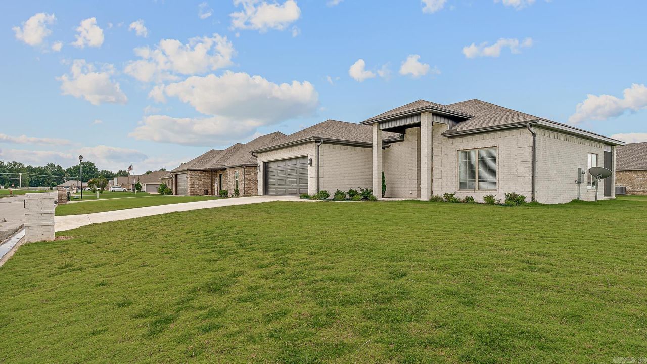 Built in 2023, this 3-bedroom, 2-bath home offers 1,441 square feet of thoughtfully designed space with a built-in saferoom, modern electric fireplace, screened-in back porch, and premium upgrades???all on a spacious corner lot. Polished, private, and perfectly positioned, this meticulously-maintained home features crisp white brick, rich laminate flooring, chrome fixtures, and an open-concept layout ideal for everyday living. The kitchen showcases granite counters, stainless appliances, a subway tile backsplash, and a large breakfast bar and kitchen island. The primary suite includes a glass walk-in shower with removable accessibility features, while the screened porch and oversized lot extend your living space outdoors. With new construction efficiency, a two-car garage, and easy access to Jonesboro, this home blends comfort, style, and smart design.