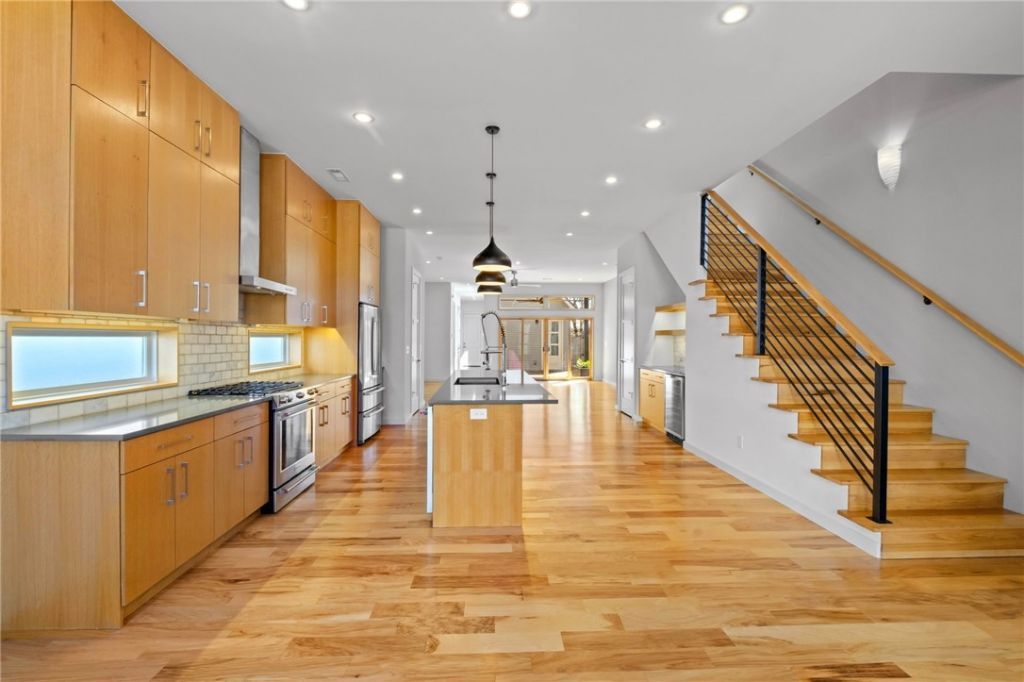 Immaculate and MOVE-IN READY! This modern home offers exceptional downtown Bentonville living in the vibrant Arts & Market District. An abundance of natural light throughout, expansive windows, modern finishes and warm hickory floors create an inviting and sophisticated space. The main level includes: quartz countertops, large island, ceiling-height cabinetry, premium appliances, pantry, coffee/wine bar, dining, 1/2 bath, garage access, nook, storage closet and 2 coat closets. Upstairs, the primary suite offers cathedral ceilings, large windows and a spa-inspired bath with a high-end bathtub and a large walk-in shower. Two spacious bedrooms, a full bath, laundry room, linen closet and a flexible space ideal for a home office make the second floor functional. 2-car garage with ample attic storage. Outdoor living includes a covered composite deck, fenced yard with natural grass and 2 gates. Located across from Thaden School & minutes from Walmart Home Office, The Momentary, Crystal Bridges & the Bentonville Square.