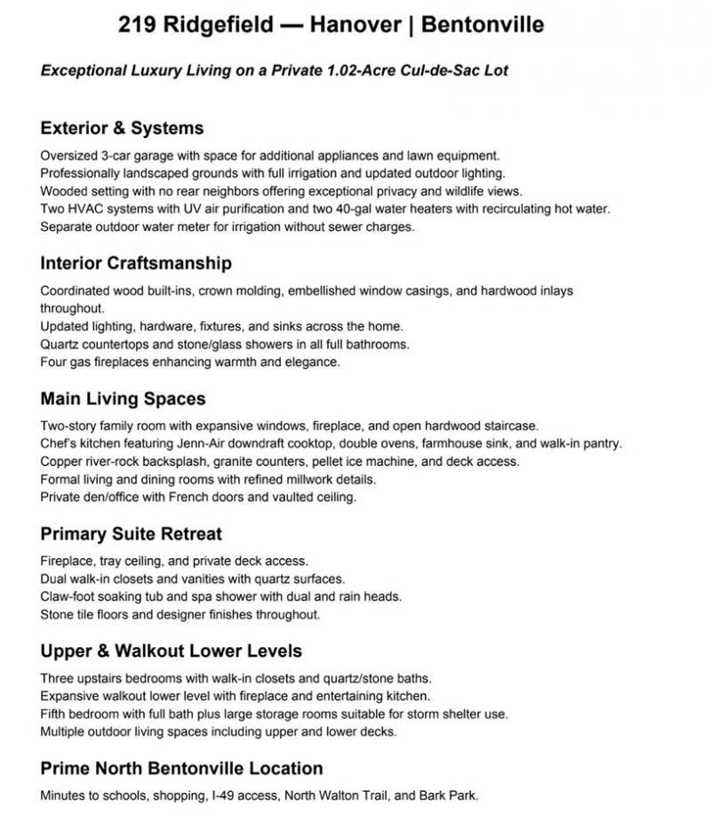 Exceptional value for this immaculate 5,579 SF Hanover home offering space, style, and an unbeatable Bentonville location just minutes from downtown, Crystal Bridges, and the region's renowned trail system. Designed for both everyday living and entertaining, the home features a beautifully redesigned kitchen with high-end appliances, quartz countertops, and a large island. Multiple fireplaces, dual living areas, and an upstairs bonus room with balcony provide flexible spaces for gathering or relaxing. A private office with built-ins offers an ideal work-from-home setup. The spacious primary suite includes a fireplace, updated en suite bath, and dual walk-in closets. Recent upgrades include a new roof, gutters, downspouts, and tankless water heater. Enjoy the Trex deck overlooking a secluded backyard retreat. Seller offering paint and flooring allowances plus a 1-year home warranty with acceptable offer.