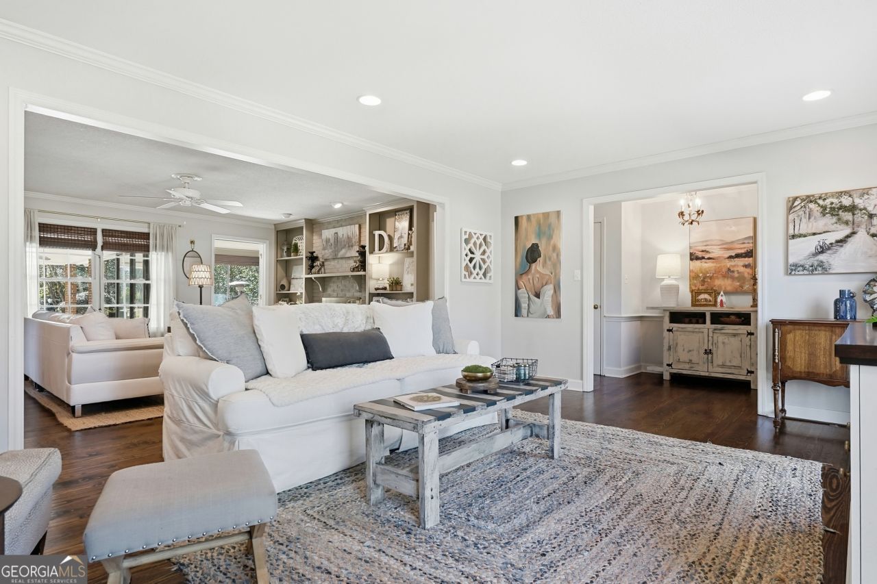 Welcome to this exceptional brick home located in the heart of Doublegate subdivision. Nestled on Winchester Circle, one of the most desirable loops within the golf course, this corner-lot property offers an unbeatable combination of location, charm, and lifestyle. This spacious 4-bedroom, 2.5-bath home features gorgeous hardwood floors throughout the main living areas and an open, flowing floor plan designed with entertaining in mind. The large living room opens seamlessly into the family room, where a stunning fireplace and built-in bookshelves create a warm and inviting focal point. Also open to the living and family rooms are the kitchen and dining areas, making this home ideal for gatherings both large and small. The updated kitchen is equipped with granite countertops, stainless steel appliances, a center island, breakfast bar, and ample pantry space. A convenient half bathroom is located just off the kitchen near the laundry area. The laundry room offers cabinets for storage, additional shelving, and a sink, providing both functionality and convenience. Just off the family room is a lovely sunroom filled with windows and natural light. This heated and cooled space adds to the home's square footage and offers a relaxing area to enjoy year-round. The sunroom opens to outdoor entertaining spaces, including an open patio and a beautiful deck perfect for grilling, dining, or hosting guests. The primary bedroom features two closets along with convenient access to a beautifully updated bathroom. This gorgeous bath includes dual vanities, a tiled shower, and a linen closet. The guest bedroom at the end of the hall includes two closets and shares a jack-n-jill bathroom with one of the other guest bedrooms. This Jack-n-Jill bathroom features dual vanities. A fourth bedroom, which may also serve as a home office, features glass doors that open directly into the sunroom, offering flexibility and abundant natural light. Additional features include a carport with a storage room and beautifully landscaped grounds that provide privacy in the backyard. This home truly is an entertainer's delight indoors and out. Doublegate is known for its active and welcoming community, where golf carts are commonly seen traveling from home to home for dinner parties and social gatherings. Located just a short golf cart ride from Doublegate Country Club & the golf course, this home offers not just a place to live, but a lifestyle to enjoy.