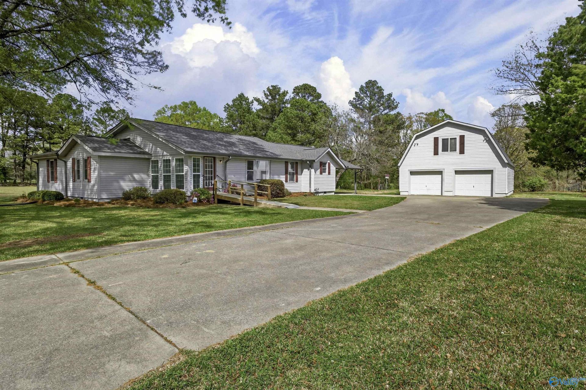 Peaceful country living on 5 beautiful acres! This well kept home offers 3 oversized bedrooms and 2 bathrooms, Sunroom, living room and family room giving you plenty of space to spread out. Clean and well-maintained mixes classic charm and thoughtful updates. Large kitchen with new LVP flooring and tile backsplash. Freshly painted throughout, new sheetrock and vinyl windows Outside is perfect for animals, gardening or just enjoying the view. Property includes a carport and a detached 2 story garage with power, ideal workshop, storage or even future living space above. If you have been looking for simple peaceful living in the heart of Hokes Bluff this property is for you