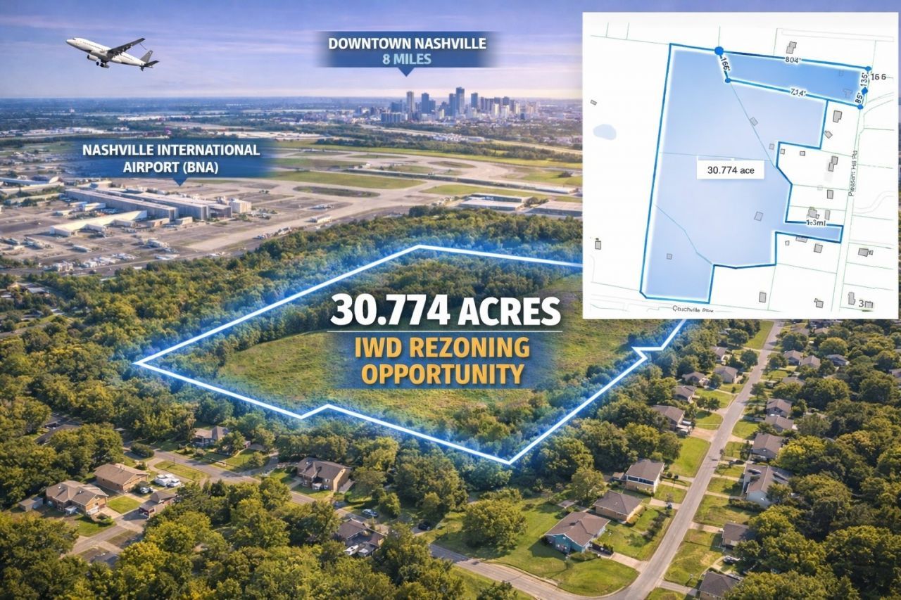 30.774 Acres | Airport Submarket | IWD Rezoning Opportunity Rare opportunity to acquire 30.774 acres in Nashville's high-demand airport corridor-strategically positioned for Industrial Warehouse Distribution (IWD) users seeking scale, access, and long-term growth. Currently zoned R15 (Multi-Family Residential), the site presents a clear path for Master Plan amendment and rezoning to IWD, aligning with the area's ongoing industrial expansion and demand for logistics, last-mile distribution, and warehouse development. This is one of the last remaining large-scale tracts in the airport submarket, offering the size and flexibility required for modern industrial users, including distribution hubs, flex industrial, or build-to-suit opportunities. Located minutes from Nashville International Airport (BNA) with immediate connectivity to I-24 and I-40, the property provides exceptional regional and national access-ideal for operators prioritizing transportation efficiency and workforce accessibility. All Letters of Intent (LOIs) are due by May 18, 2026. A true infill industrial play in a supply-constrained corridor-scale, location, and entitlement upside position this offering for strong investor and user demand.