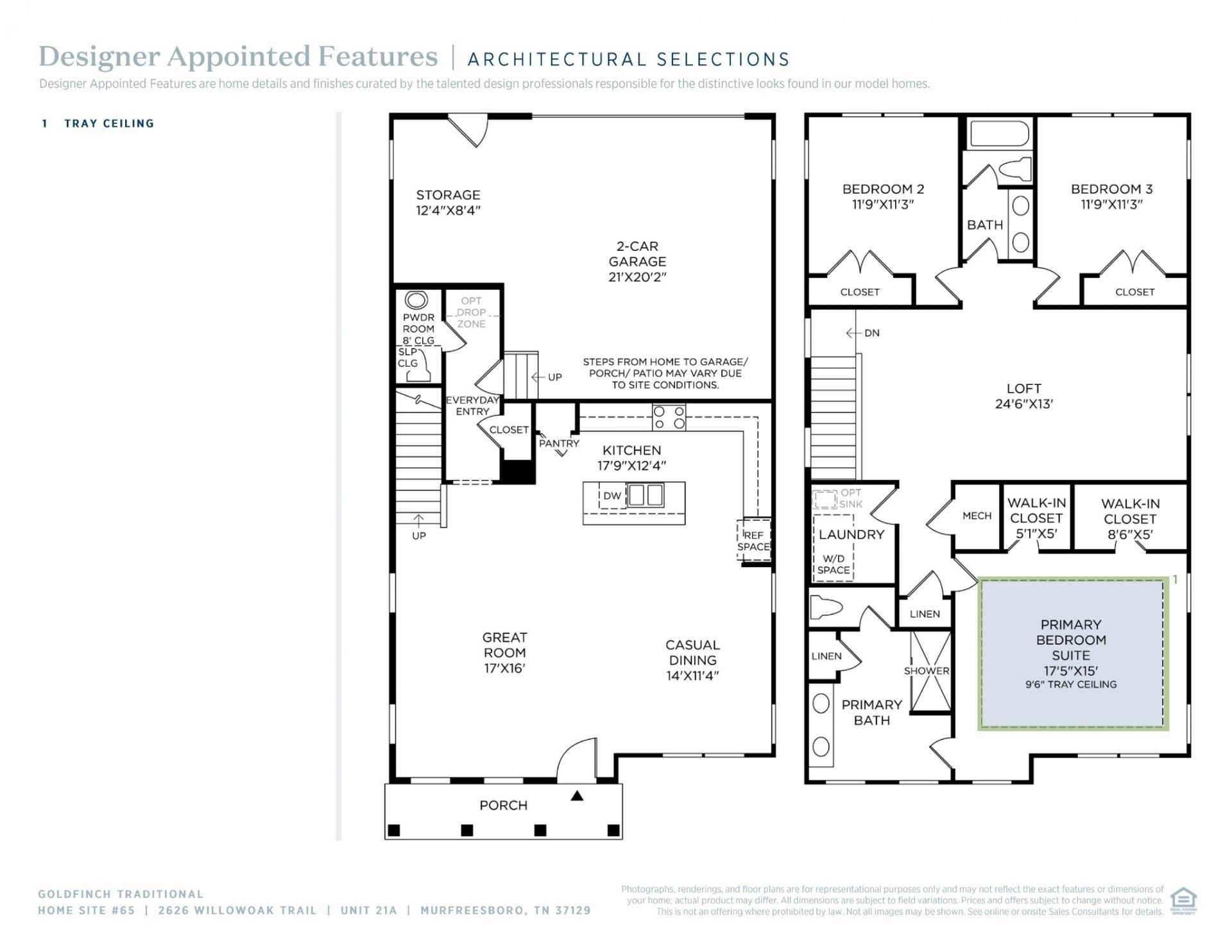 Welcome to Meadowlark by Toll Brothers! The Goldfinch floor plan with the Traditional elevation is situated on homesite 65 and is estimated to be completed by May 2026.The spacious layout invites natural light throughout, with a seamless flow between the kitchen, dining, and living areas on the first floor. The gourmet kitchen offers a sleek design with a ton of cabinets, a sizable pantry, and ample counter space for cooking and hosting. The first floor also houses a spacious 2-car garage with room for extra storage. Upstairs, the master suite provides a peaceful retreat, complete with a luxurious walk-in tile shower and generous dual walk-in closets. Two additional bedrooms with shared bath offer versatility for family, guests, or a home office. The second floor also provides a spacious loft for a second living space. A convenient laundry room is located on the second floor for quick access. DESIGN SELECTIONS ARE MADE FOR THIS HOME - PRICE IS FINAL WITH ALL OPTIONSIdeally located next to Clari Park, across from The Avenue, just steps away from popular dining, shopping, and entertainment options in Murfreesboro. This home combines comfort, style, and the flexibility to design your dream living space! Contact the on-site sales consultant for more information. Photos and renderings are for representational purposes only. Colors and finishes will vary.