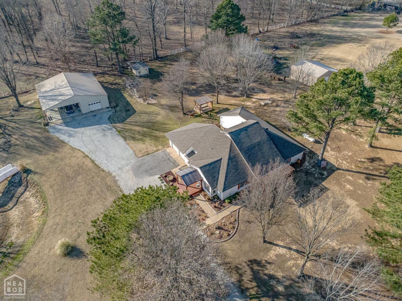 Welcome to Market 282 County Rd 723 of North Haven Hills in Jonesboro, AR within the Brookland School District. Situated on 2.60 acres on Crowley's Ridge outside of city limits is a Southern-style Ranch wrapped in vinyl, topped w/ 2025 architectural shingles, and accented by shutters, a 2-car side-entry garage, covered front porch, wood decks, and mature landscaping. The interior features 3,110 sf of well laid out living space that offers a living/dining room w/ stone details and a cozy gas fireplace, eat-in kitchen w/ pantry, granite countertops, and stainless-steel appliances, primary suite w/ 2 walk-in closets and an en-suite w/ walk-in shower and jetted slipper tub, 2 spare bedrooms separated by a Jack-n-Jill bathroom w/ shower/tub combo, and a laundry room on the main. Upstairs is a 2nd living area, bedroom, and bathroom w/ walk-in shower. You'll love the 48x50 floored & wired shop, stocked pond featuring a central island w/ gazebo accessed via a beautiful arched bridge, pergola, garden shed, and greenhouse. Enjoy frequent wildlife visits from ducks and deer and the Willow, Oak, and Apple trees along w/ berries that adorn the acreage. Call today to make this house your home.
