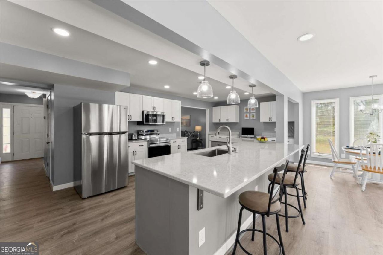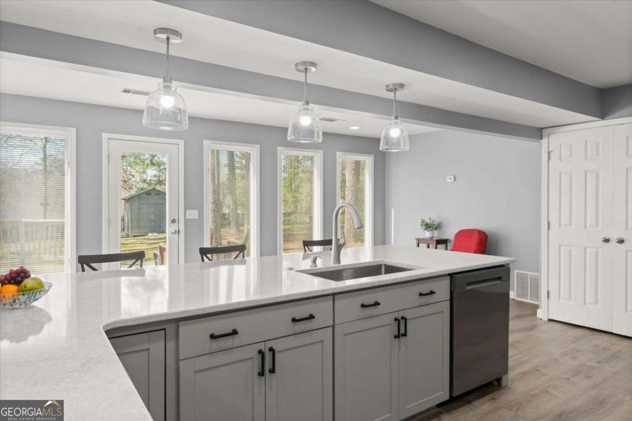 Welcome home to this beautifully RENOVATED, move-in-ready home featuring a massive, flat, FENCED backyard, just minutes from Sope Creek and top-tier East Cobb schools! This classic traditional home is tucked away in a quiet Marietta neighborhood, offering the freedom of no HOA. As you step inside, the main level shines with NEW LVP flooring, a sophisticated neutral palette, smoothed ceilings, and recessed lighting. The true centerpiece is the reimagined CHEF'S KITCHEN, designed for modern living with white shaker SOFT-CLOSE cabinetry, elegant QUARTZ countertops, and sleek STAINLESS STEEL appliances. Thanks to raised ceilings, the space feels grand and airy, flowing seamlessly into a sun-drenched SUNROOM. Step out from the sunroom onto an OVERSIZED DECK overlooking your private, manicured backyard, complete with a storage shed. The kitchen opens directly to the family room, making it perfect for HOSTING movie nights or playdates. A separate den, anchored by a whitewashed GAS FIREPLACE, offers a quiet retreat for reading or relaxing. The primary suite is a true SANCTUARY, featuring designer-inspired finishes, a WALK-IN CLOSET with custom built-ins, and a private sitting area overlooking the lawn. Upstairs, three additional bedrooms, all freshly painted including ceilings, share a hall bath with DUAL VANITIES. You are MINUTES from Sope Creek, East Cobb Park, and Marietta Square. Commuting is a breeze with quick access to the 120-loop and I-75.