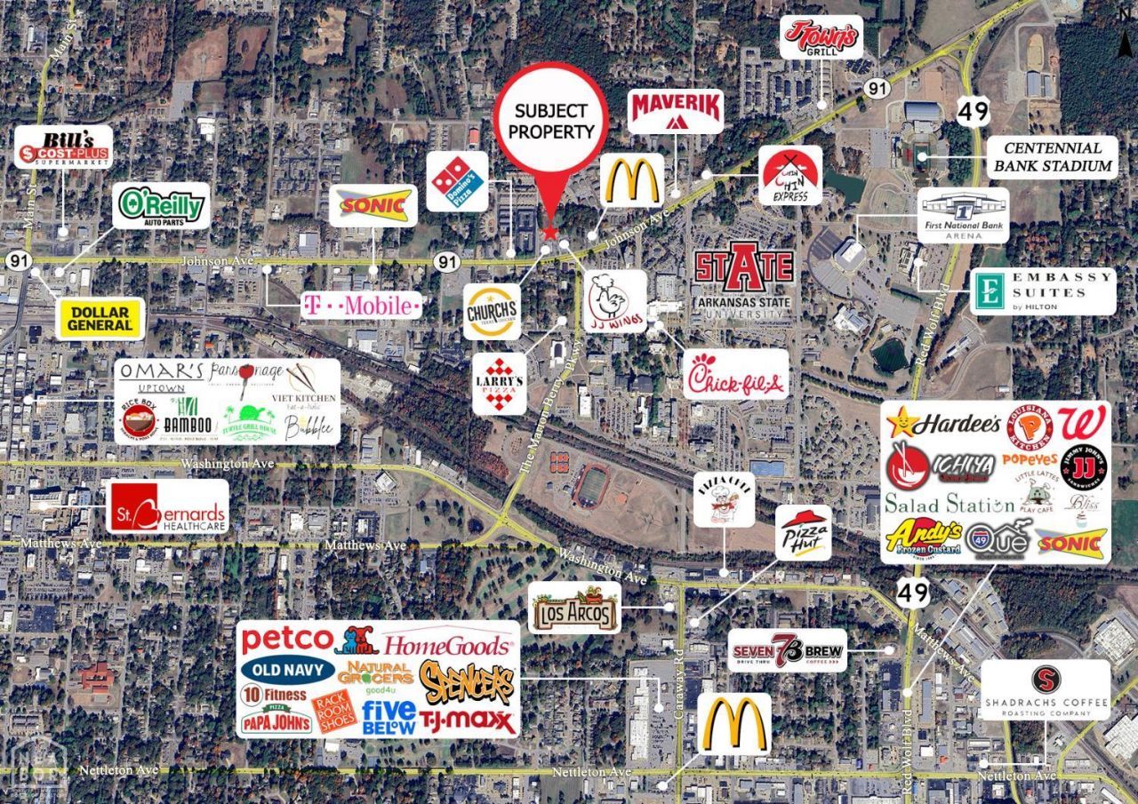 Welcome to Market 3.67 +/- Acres on Melrose Street and Russell Drive in Jonesboro, Arkansas. Golden Opportunity Knocks. Commercial Property zoned C-3 situated on 3.67 +/- acres with a 7 Unit Retail Strip Center and .65 +/- acre lot available to purchase separately. Located across the street from Arkansas State University and near Northeast Arkansas Baptist Memorial Hospital, Jonesboro Municipal Airport, and favorite local retail & dining establishments. Property runs block to block and has two access points/potential driveways/entry points. Estimated daily traffic counts of 20,000. Offerings such as this are few and far between. Call today to schedule your tour and make an investment in tomorrow.