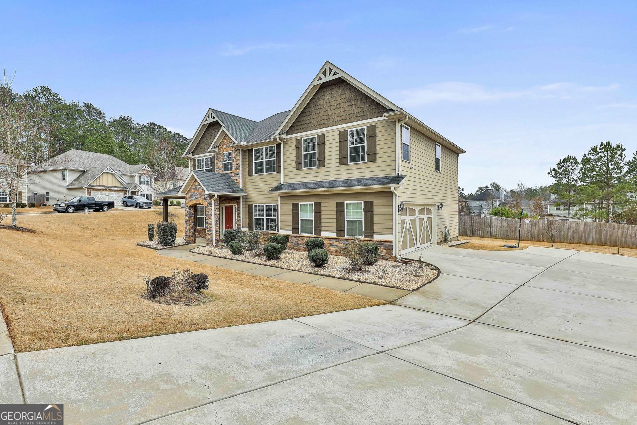 This beautiful 4-bedroom, 2.5-bath home, built in 2018, is on a large, premium corner lot in the highly desirable Parkside Village of Sharpsburg, GA. Offering rare privacy, the neighboring property is HOA-owned green space that will remain undeveloped. The side-entry two-car garage and extended driveway create striking curb appeal and an elegant first impression. Inside, the home features modern design and thoughtful upgrades throughout, including LVP flooring throughout, rounded corners, accent ceilings, crisp neutral tones, and smart home security. The foyer opens to a formal dining room and a versatile office or flex space with barn doors. The inviting family room with a wood-burning fireplace flows seamlessly into the upgraded kitchen, complete with recently upgraded Quartz countertops and backsplash, stainless steel appliances, a large island, and a walk-in pantry. A powder room and mudroom with built-in storage complete the main level. Upstairs, all four bedrooms include walk-in closets. The spacious primary suite is privately located and features a sitting area and electric fireplace. The luxurious en-suite bath offers dual vanities, a soaking tub, a tiled shower with bench, two walk-in closets, and a private water closet. Three additional bedrooms share a full bath, and a large laundry room is conveniently located on the second floor. Step outside to the impressive game-day porch-perfect for year-round entertaining. Enjoy the fireplace, watch the big game, or relax under string lights with the privacy shades closed for a cozy retreat. Lawn Care is included. Parkside Village is a well-established neighborhood ideally located between Newnan and Peachtree City, with easy access to dining, shopping, entertainment, and a quick commute to Atlanta via I-85 in under 30 minutes.