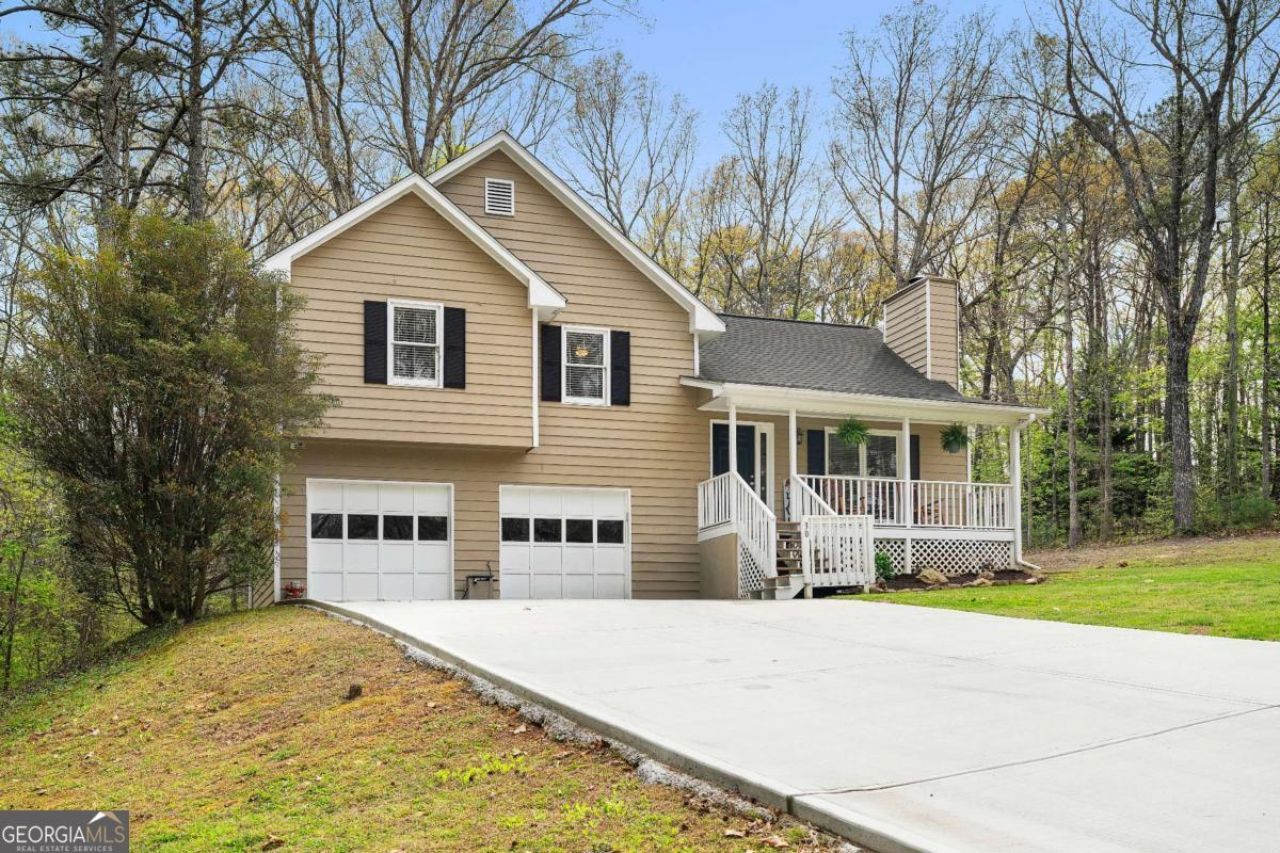 Beautifully maintained home nestled on a private, wooded lot just minutes from I-75, offering both convenience and tranquility. Enjoy your mornings on the spacious covered rocking chair front porch, perfect for relaxing with coffee. Step inside to a bright, open living room featuring a cozy fireplace and durable laminate flooring throughout the main living areas. The separate dining room flows seamlessly into the kitchen, which offers ample cabinet space and a window over the sink overlooking the serene backyard. The spacious primary suite features elegant tray ceilings and a private bath with a garden tub, separate shower, and plenty of room to unwind. Step out back to a large deck, ideal for entertaining or enjoying peaceful evenings surrounded by nature. Don't miss this opportunity to own a private retreat with easy access to shopping, dining, and the interstate!