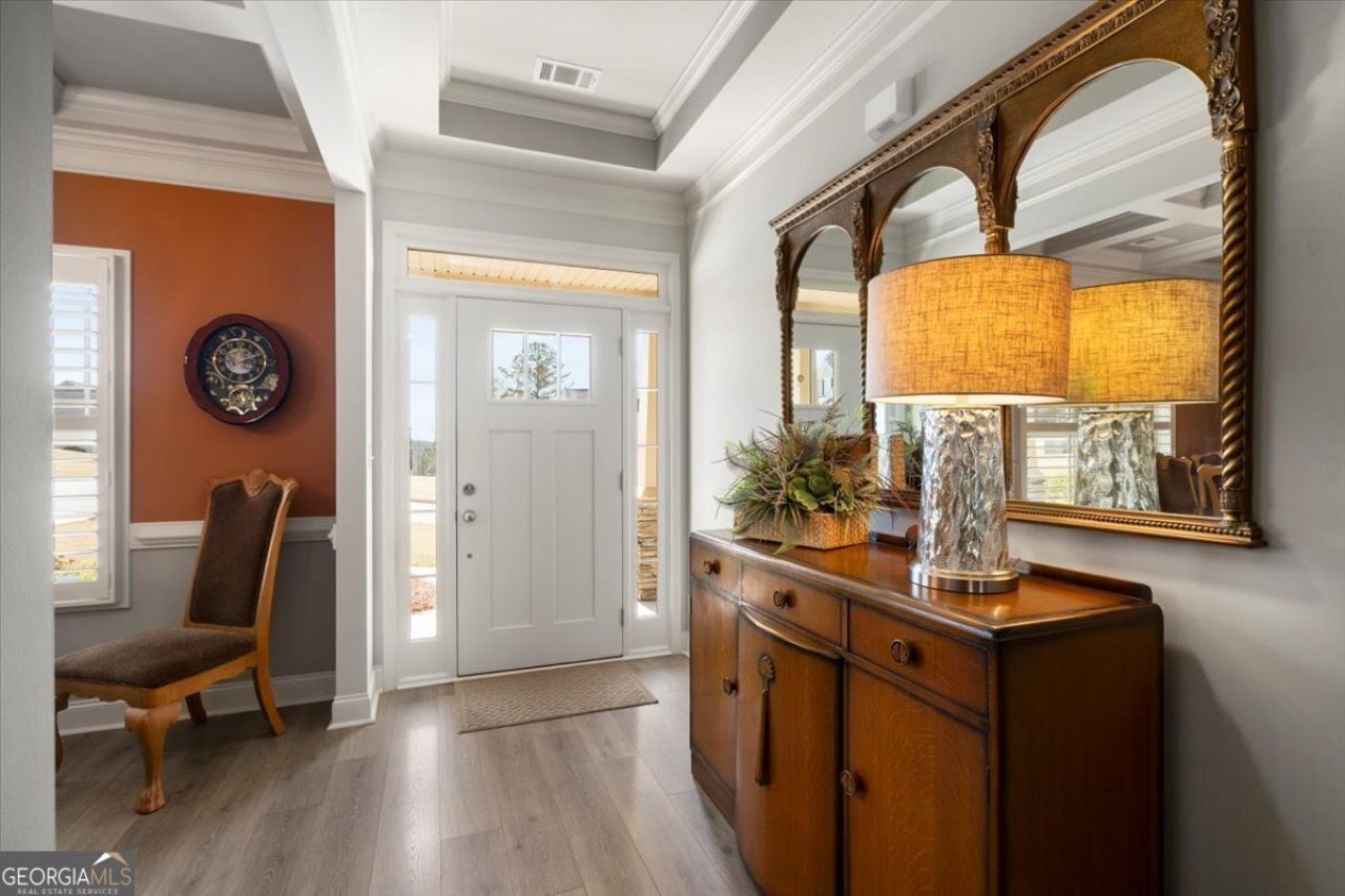 Welcome to your dream home in the sought-after Alcovy Bluffs community! This meticulously maintained 4-bedroom, 3-full bath residence is ideally situated on over half an acre of beautifully landscaped, level lot. Enjoy the seamless flow of the open-concept living space, featuring a stunning kitchen, spacious dining area, and inviting living room. As you step inside, you'll be greeted by elegant vaulted ceilings in the living room and charming coffered ceilings in the dining area, setting the tone for stylish gatherings. Enjoy cozy evenings by the inviting brick gas fireplace or prepare delightful meals in the modern kitchen. Stove top is plumbed for gas. All three bedrooms are conveniently located on the main floor for ultimate comfort, including the owners suite. The owners suite is a true retreat with its elegant tray ceilings, generous walk-in closet, and luxurious en-suite bathroom showcasing dual vanities, a sumptuous soaking tub, and a beautifully tiled shower. A versatile large bonus room and a full bath upstairs provide additional space, perfect for a home office, guest suite, or playroom. Step outside to the expansive covered back patio, ideally designed for entertaining, with ample grilling space perfect for family cookouts or garden parties. Built in 2018, this home has been exceptionally cared for and features LVP flooring throughout the main living areas for easy maintenance. Additional features include a spacious 3-car garage and access to the community's fantastic amenities, which include a pool, tennis courts, pickleball facilities, sidewalks, and well-lit streets for evening strolls. It's not just a home; it's a lifestyle. Don't miss this opportunity to own a piece of paradise in Alcovy Bluffs. Schedule your tour today!