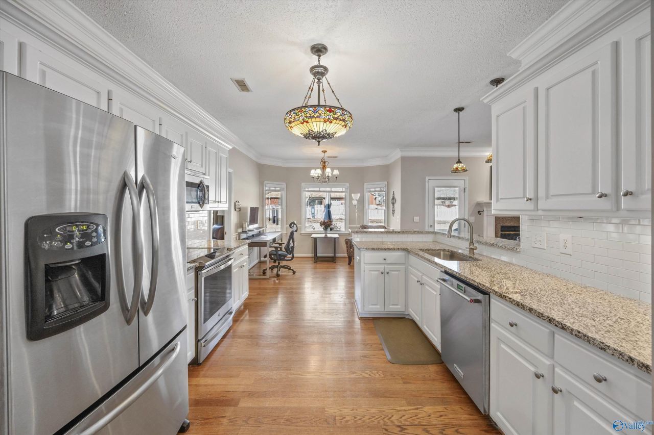 Open floor plan filled with natural light in this one-level, 4-bedroom home in Hampton Cove! Enjoy peaceful nature views from your private back patio. The isolated primary suite features a beautifully updated bath. Gorgeous hardwoods flow through the family room, dining area, and kitchen. Three spacious secondary bedrooms offer ample closet space. Crown molding and trey ceilings add charm and detail. Roof 2017, gutters 2020, Terminix bond. Short drive to Robert Trent Jones Golf Trail, shopping, dining & entertainment. 20 minutes to Redstone Arsenal and Downtown Huntsville. Ready to call home!