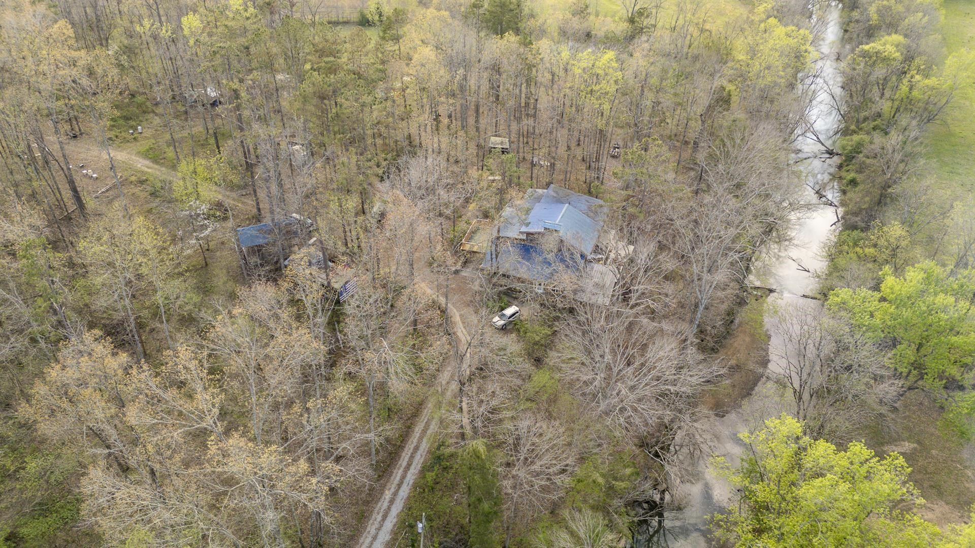Nestled on 55 private wooded acres +/- with stunning Turkey Creek frontage, views, & access, this one-of-a-kind rustic lodge-style home offers incredible potential for a dream retreat or homestead! Featuring two levels plus a walkout basement, the home is anchored by the centerpiece...a double-sided stone fireplace soaring to the vaulted ceiling! The great room opens to a deck overlooking the creek...perfect for morning coffee, a little fishing, or kayaking fun. Inside includes two primary suites, an office w/built-ins, & a spacious kitchen w/island, spacious pantry, eat-in bench seating, & expansive dining area perfect for entertaining. Upstairs offers a loft, more deck access, & flexible sleeping space. An additional structure adds even more potential for a future in-law suite. Ideal for hunting, gardening, & self-sufficient living, w/room for chicken coops & ample storage for canning. A rare opportunity to create your private escape with unmatched land, character, and possibilities!