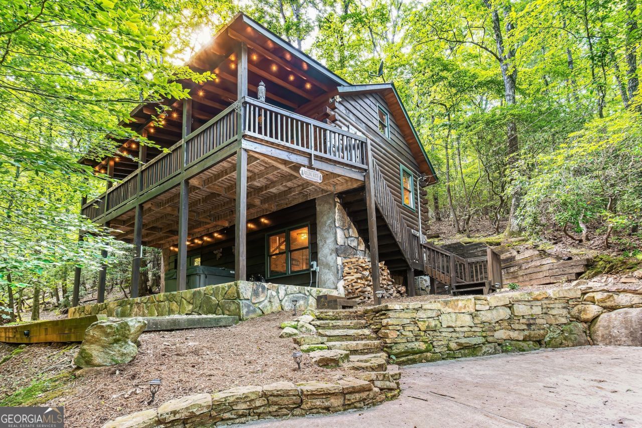 This well-maintained 2BR/1BA cabin in Walnut Mountain is 1200 sq. ft. of charming mountain living surrounded by beautiful forest and would make an awesome vacation home. This country rustic home packs a lot of living space into its layout, with every nook made useful, such as the loft bonus room which is currently set up with a bed. The living room features a vented wood burning fireplace for those cozy winter nights, and the kitchen and dining area are nearby for a close family or social atmosphere. The full basement is finished, with a family / game room, laundry closet, under-stairs closet, and utility / owner's closet. The covered patio has a soothing hot tub, and the main level deck has a table for outdoor breakfasts or dining, with a view of the little stream that runs at the bottom of the property. There is a trail that leads to a sitting area, also with a view of the stream, which is guarded by a (mostly) friendly Bigfoot. Walnut Mountain is a private gated community and offers a lot of amenities, such as a swimming pool, club house, tennis courts, playground, dog park, hiking trails, campground, and access to several lakes.