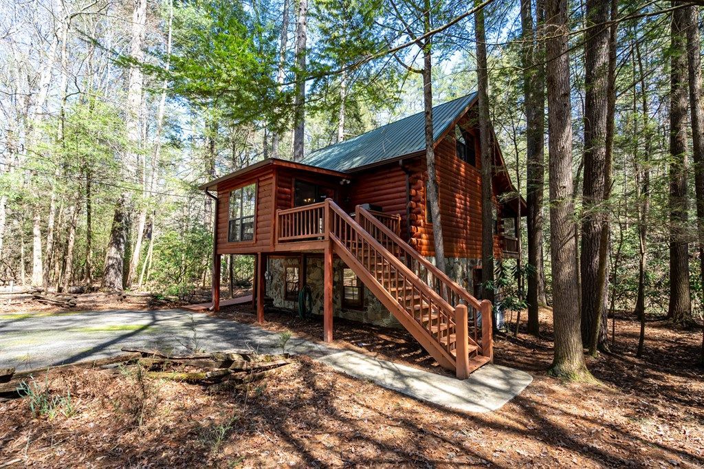 Welcome to your North Georgia mountain retreat where comfort, privacy, and the soothing sounds of Fightingtown Creek come together to create the perfect escape. This charming 2-bedroom, 2-bath cabin also features a spacious loft with an additional king-size bed, offering plenty of room for family and guests. Inside, you'll find a warm and inviting interior with wide plank hardwood floors on the main level and loft, along with granite countertops in the kitchen and primary bathroom. Every detail is designed to create a cozy, relaxed mountain atmosphere. What truly sets this property apart is its exceptional setting?boasting approximately 100 feet of frontage on Fightingtown Creek, one of North Georgia's premier trout streams. This stretch of the creek is especially desirable, with gentle, smooth-flowing water perfect for tubing, relaxing, or simply enjoying a peaceful day by the water. Just beyond the property, the creek cascades over a rocky section, creating a natural soundtrack that can be enjoyed from the cabin?simply open the windows at night and let nature do the rest. Outdoor living is just as impressive as the interior. Enjoy breathtaking views from the screened-in back porch, gather around the firepit for s'mores under the stars, or cast a line from your own creekside dock. The setting is private yet easily accessible?offering the best of both seclusion and convenience. While this cabin has never been used as a rental, short-term rentals are allowed, presenting an excellent opportunity for investment income or a personal getaway. Located just minutes from downtown Blue Ridge, you'll have easy access to some of the area's most sought-after attractions, including hiking and biking trails, trout fishing, waterfalls, apple orchards, and a vibrant downtown filled with locally owned shops, restaurants, and wineries. Whether you're seeking adventure or relaxation, this location offers the best of both worlds.