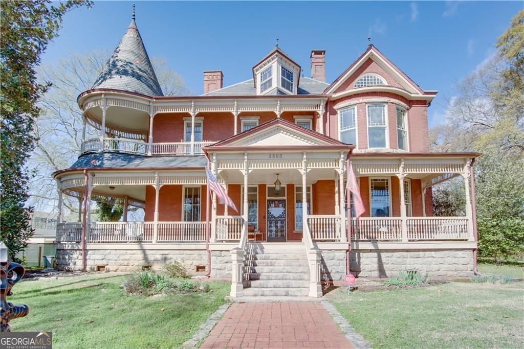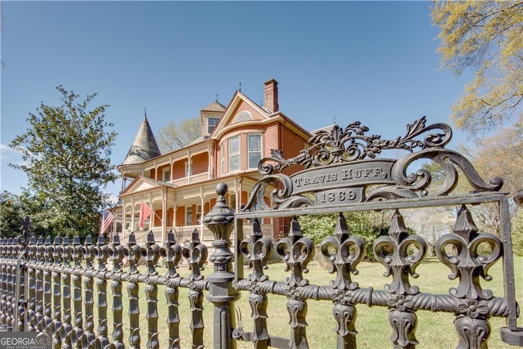 Rare opportunity to own the historic Palmour House, one of College Park's original residences, built circa 1892. This one-of-a-kind property is rich in history and architectural significance, originally constructed for Dr. William Crenshaw, a prominent early figure in the community. In 1931, the home was purchased by his daughter, Mary Palmour, and her husband Oscar, giving rise to the name Palmour House. A stunning example of Queen Anne Victorian architecture, the home has changed hands only a handful of times and has been meticulously restored to preserve its historic charm while incorporating modern functionality. Situated on two parcels totaling approximately 1.3 acres, the property offers exceptional flexibility. The main residence sits on a .9-acre lot, with an additional .4-acre parcel fronting College Street that may offer future resale or development potential. Most recently used as a single-family residence, the property is also located within the City of College Park's Transit Oriented Development (TOD) zoning, allowing for a wide range of potential uses including office, retail, event space, bed and breakfast, restaurant, or continued residential use. Inside, soaring 12-foot ceilings and abundant natural light highlight exquisite period details, including stained and beveled glass, 12 unique fireplaces, intricate plaster ceiling designs, hand-carved millwork, and a thoughtful blend of original and replica fixtures. The grand foyer showcases exceptional craftsmanship and an original decorative wooden trellis. The library/living room features built-in bookshelves, a pressed tin ceiling, and an intricately carved fireplace mantel, while a private office with built-ins and floor-to-ceiling windows sits just off the foyer. The formal dining room comfortably seats 12, and the chef's kitchen features soapstone countertops, a five-burner stove, industrial-sized refrigerator, butler's pantry, and a historic pressed tin ceiling. Additional living space includes a spacious great room that opens to the back porch, overlooking the pool and expansive backyard. The main-level primary suite offers a large walk-in closet with fireplace and a beautifully updated bath featuring a clawfoot tub and separate shower. Upstairs, the second level includes five oversized bedrooms, two with sitting area, and two updated bathrooms with walk-in showers, marble, and subway tile finishes. A finished bonus space on the third-floor attic and a large basement provide even more flexibility. The exterior showcases classic Victorian detailing, including a rocking chair front porch with gingerbread scrollwork and cypress flooring, patterned slate roof, granite lintels and foundation, decorative friezes, a domed turret, and steep gables. The beautifully landscaped 1.3-acre grounds feature a recently resurfaced pool and ample parking, with access from both College Street and Hemphill Street, ideal for residential or commercial use. Located just 1 stop on the Marta train to the Atlanta Airport and walking distance to the train station. Also just steps from Woodward Academy and minutes to MARTA, the airport, Delta, Porsche, and all major Atlanta highways. Historic College Park is a wonderful community to live, work and play!