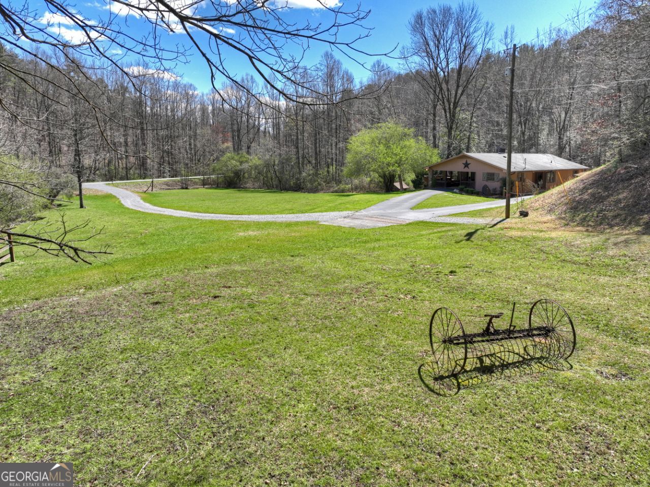 First time on the market, this one-of-a-kind TURN KEY, FULLY FURNISHED RUSTIC RANCH sits on 3.7 acres of pristine & highly sought-after PASTURE w/ NO HOA & is almost entirely surrounded by CREEK frontage on desirable Boardtown Rd, just 5 miles from downtown Ellijay. This 1967 3BR/2BA ranch has been thoughtfully updated & meticulously maintained, blending original character w/ a Western flair. The long winding driveway sets the tone for this unique retreat, leading to a custom WESTERN BAR/ENTERTAINMENT covered area w/ TV, rustic pine ceiling & comfortable seating for entertaining, plus access to a large laundry/mechanical room w/ sink. Inside, enjoy a spacious living area w/ rock gas log fireplace, original hardwood floors & a large picture window showcasing the scenic property, along w/ a generous dining room & vintage kitchen featuring a coffee bar, NEW APPLIANCES, & brick accent wall. All bedrooms are generously sized w/ hardwood flooring, including a renovated guest bath w/ tile flooring, granite counter, custom cabinetry & tile shower, while the primary suite offers built-ins, dual closets & an ensuite bath w/ tile shower & large granite vanity. Step outside to a covered back porch w/ swing & hot tub, then down to a large firepit area perfect for gatherings. An additional WESTERN REC BUILDING is also FULLY FURNISHED & ready to enjoy w/ real hardwood floors, wide plank walls, vaulted beamed ceilings & HVAC for year-round use. Two vintage cattle barns provide excellent storage, & a large pasture/garden area is accessible by bridge over the creek. A hillside cellar offers convenient storage. UPGRADES include NEW WINDOWS, termite bond, 2019 HVAC, new exterior doors, 2025 WATER HEATER, BRAND NEW STOVE & DISHWASHER. Conveniently located near Roo Vineyard & just minutes to downtown Ellijay w/ all paved access-this truly is a rare slice of heaven that will not last!