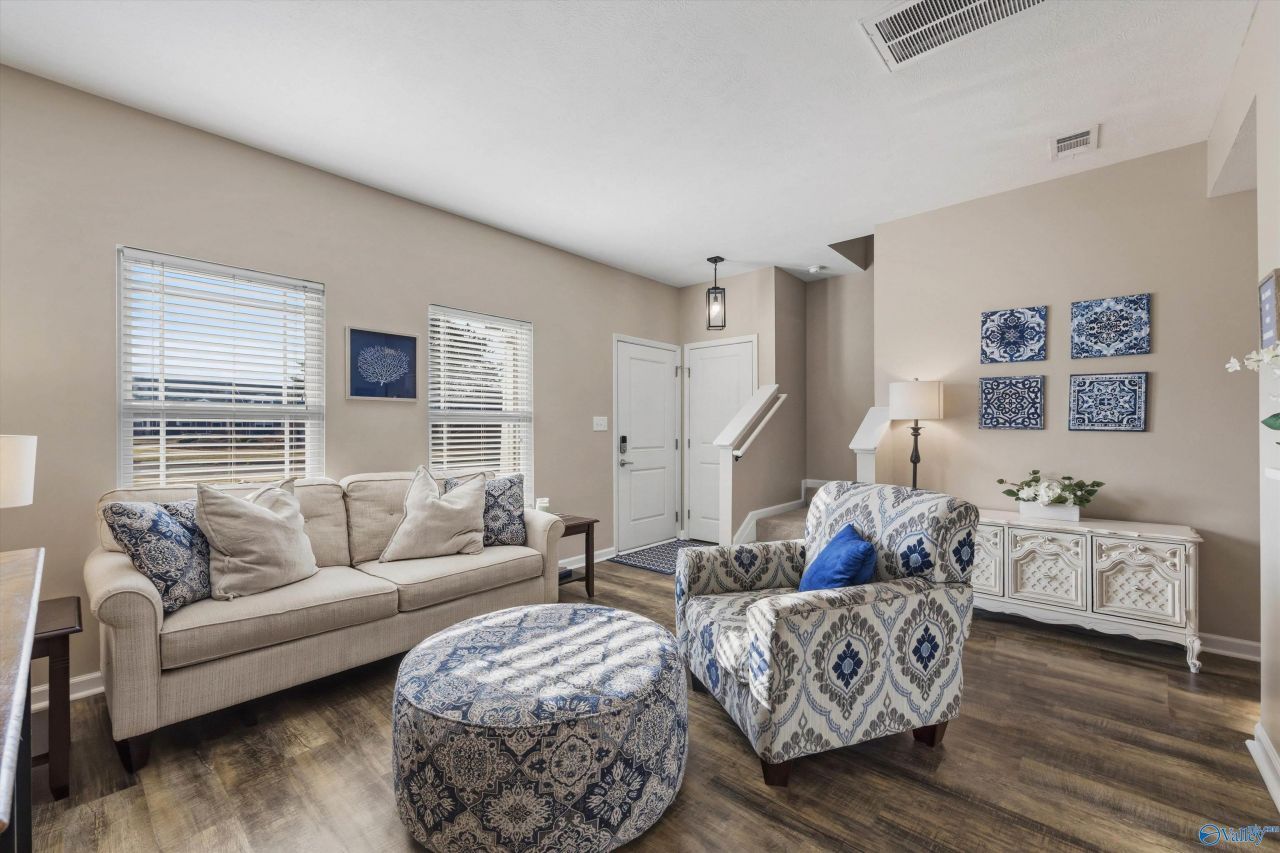 Resort-style living in Promenade at River Landing with a clubhouse, zero-entry pool & fountain, fitness center, tennis & basketball courts, playground, & more! This updated townhome offers open-concept living and features quartz countertops, LVP throughout, & modern fixtures. Both bedrooms include ensuite baths & walk-in closets! Plus, a powder room downstairs, a private courtyard, & 2-car garage. Low maintenance living with HOA covering front yard, pest/termite, & roof. All appliances included - including W/D. A turn-key investment opportunity with proven short-term rental income at $2,500/mo (furnished)! Minutes to Gate 7, Town Madison, & Huntsville Int Airport!