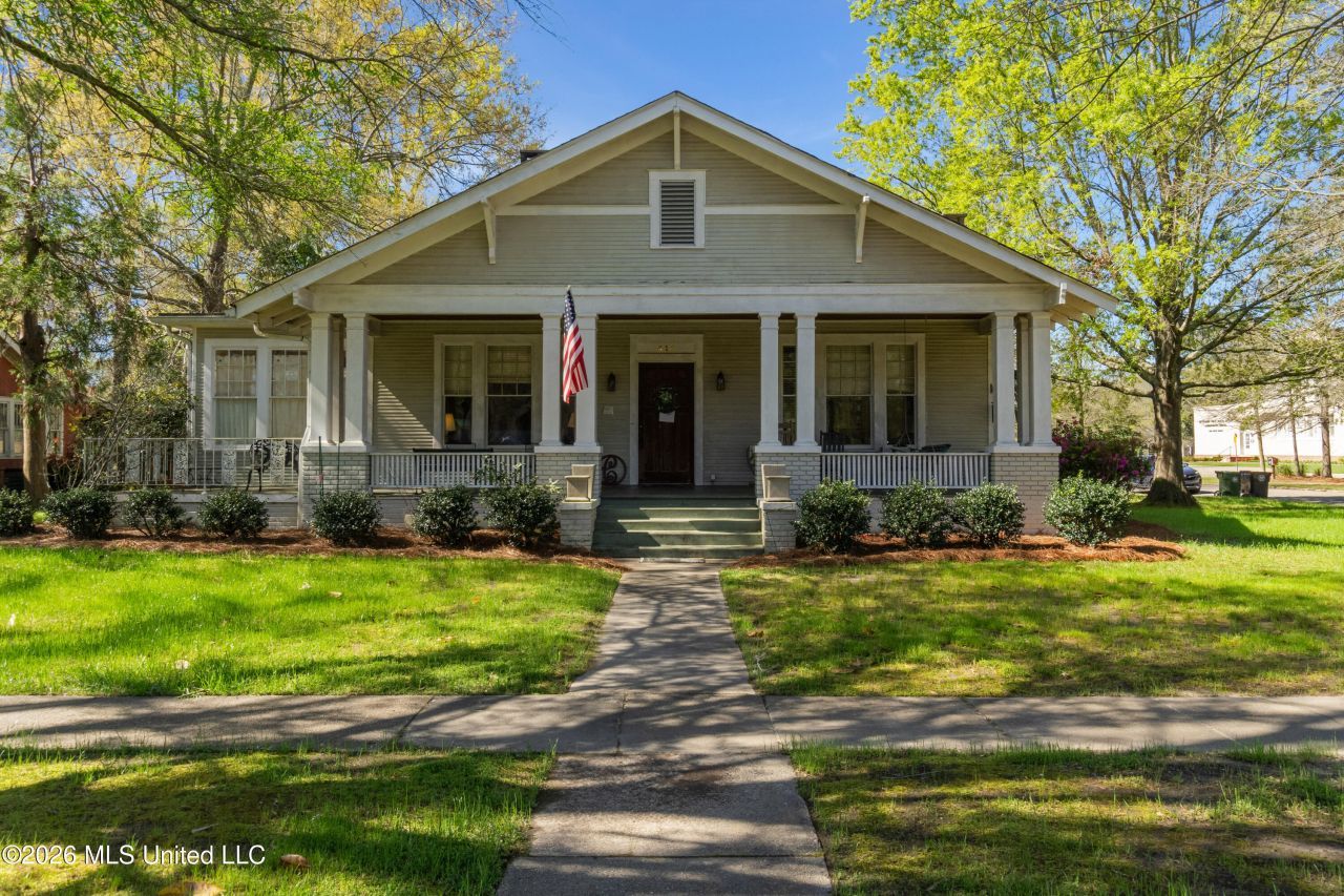 Classic Downtown Hattiesburg charm with space, character, and a floor plan you almost never find! This historic home sits on a deep lot with mature trees, a wide front porch, and over 3,000 square feet of living space including multiple living areas and five bedrooms!The exterior immediately stands out with the full-width covered front porch supported by square columns, painted brick piers, and a wood beadboard ceiling. There is plenty of room for rocking chairs, porch swings, and seating areas, and the porch overlooks the shaded front yard and sidewalk-lined street in the heart of downtown. The backyard includes a fenced patio area plus additional green space behind the house.Inside you will find tall ceilings, original wood floors, wide trim, transom windows, and large double-hung windows that bring in natural light throughout the home. The central dining room features hardwood flooring, crown molding, and a fireplace with a painted mantel, with glass-paneled doors leading to the main living room. The living room is oversized and connects directly to the large and bright sunroom that runs along the side of the house.The kitchen has black and white checkered flooring, long counters with abundant cabinet storage, open shelving, and a stainless dishwasher, with space for a breakfast table near the rear hall. Just off the kitchen is a utility area and access to the back of the home.The first floor includes several bedrooms with hardwood floors, tall windows, and wide baseboards, along with multiple full baths. The layout allows for flexible use of rooms for bedrooms, office space, or additional sitting rooms depending on needs.Upstairs you will find a large primary bedroom with dormer ceiling lines, two walk-in closets, and a private bath, along with another oversized bedroom on the second floor.Outside, the backyard includes a concrete patio and additional yard space extending behind the garage, giving this property more depth than most downtown lots.Located in Historic Downtown Hattiesburg, this home is surrounded by established homes, sidewalks, and mature trees, with convenient access to The University of Southern Mississippi, downtown restaurants, and Midtown. Schedule your private viewing of this historic Hattiesburg home today!