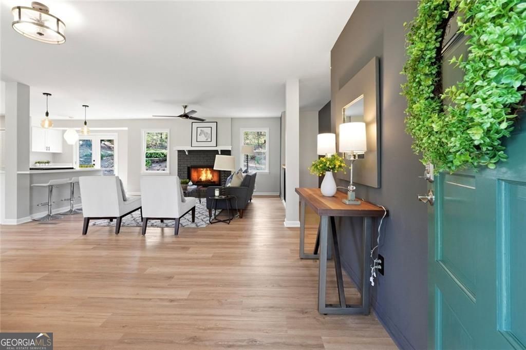 Completely renovated in 2026, this 4-sided brick ranch in Roswell sits on a wooded lot with low Cobb County taxes and no HOA! The open layout on the main floor features all-new LVP flooring, quartz countertops, white shaker cabinets, stainless appliances with a gas range, a farmhouse sink, and a 4-seat breakfast bar with a separate coffee bar area. The Kitchen flows into a large Dining Area and Family Room with a brick fireplace and open staircase to the basement. Three bedrooms and 2.5 baths on the main include a master suite with a barn-style sliding closet door and walk-in shower. The fully finished basement adds two oversized living areas with trey ceilings and a built-in electric fireplace, two bedrooms, a full bath, and a second kitchen with its own dining area, gas cooktop, dishwasher, refrigerator, granite counters, and pantry - ideal for a guest suite, in-law setup, or rental income. Brand-new basement HVAC and water heater. The back yard features a brick patio and a stone paver walkway that leads around to the driveway by the two-car garage. Less than a mile to Sandy Plains Road at Hwy 92 and 5 miles to Downtown Roswell and GA-400.