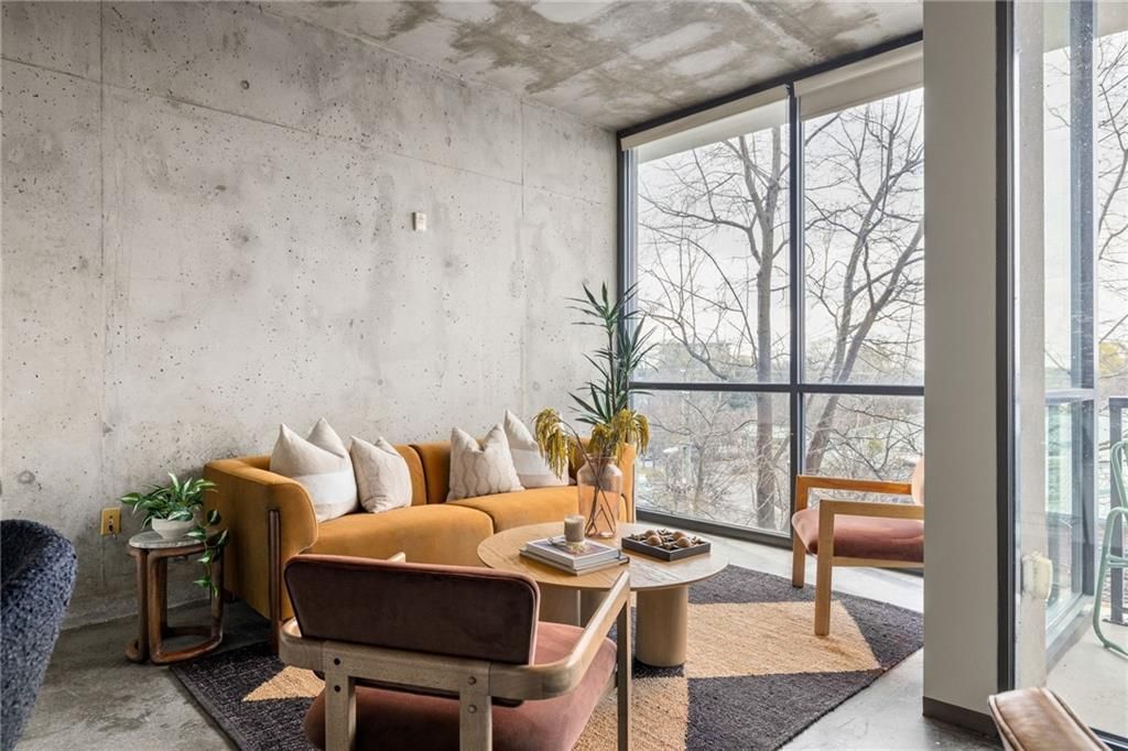 Tranquil city living in the middle of all the action--Tribute Lofts is centrally located in Old Fourth Ward just a few steps away from the Beltline, Krog St, Ponce City Market, and more. The interior welcomes you with an abundance of natural light streaming through large 10ft windows, creating a bright and airy feel throughout the main living space. An open floor plan connects the living area and kitchen, making the layout both functional and inviting for everyday living or entertaining. The kitchen features granite countertops, stainless steel appliances, and ample cabinetry for storage, along with a convenient desk nook that works well as a home office space. Step out onto your quiet covered patio for a morning coffee or some afternoon fresh air. The primary bedroom features a large closet with ample storage and a conveniently-located laundry room. Residents of the building enjoy a variety of amenities designed for comfort and convenience, including a fitness center, a rooftop pool that converts into a hot tub during colder months, and a terrace with sweeping views of the Atlanta skyline. The condo also comes with secure garage parking. Additional building features include a dog wash station, a bike storage room, access to Google Fiber, and six EV charging stations in the garage.