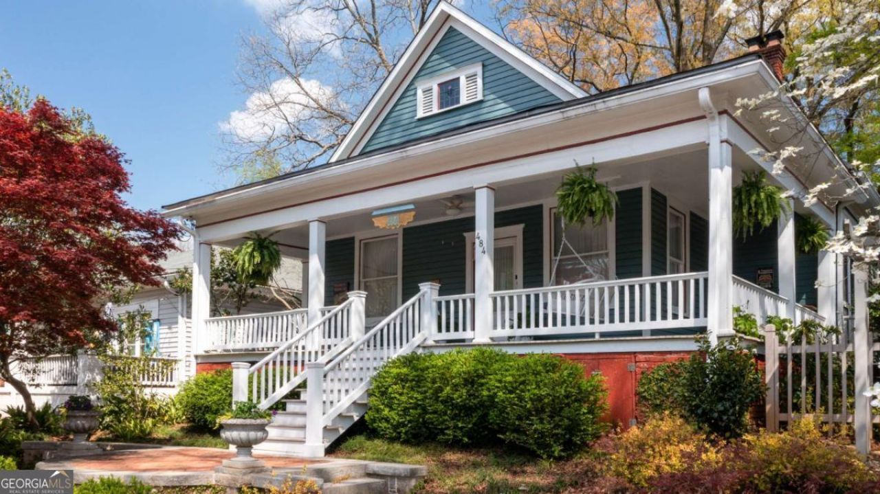 A gracious Victorian Bungalow in the heart of Historic Grant Park, with a thoughtfully curated renovation that has preserved much of the period charm of the original home. At the curb one is greeted by an elegant set of custom cut Elberton Granite stairs, which wind their way around a mature Bloodgood Japanese Maple to an inviting Landing of Herringbone Brick, bordered with curving granite capstone, and topped with matching Elberton Granite planters. From its elevated perch a warm and inviting wrapped front porch provides commanding views of sunsets to the West and the Atlanta skyline to the North. Inside one finds a gorgeous Living Room with soaring 10+ ceilings, period heart pine flooring, custom dental molding, and a working fireplace with original tile, mantle, and coal basket-one of four located throughout the house. A set of original working pocket doors leads from the Living Room to a lavishly appointed Dining Room, also with original heart pine flooring and working fireplace. The Dining Room opens to a generously scaled Den and Study (also with working fireplace), as well as a large, well-appointed eat-in Kitchen with stainless appliances, cork flooring, and Breakfast Nook. A guest bedroom, hall bath with period claw foot tub, and primary suite with large walk-in closet, full en suite bath, and French doors leading out to a private Terrace complete the downstairs. The soaring 10' ceilings continue upstairs, in an artfully arranged 2nd story addition featuring built-in period linen closet, full bath, two large bedrooms with full closets, and ample attic space. Don't miss this opportunity to make this warm and welcoming Grant Park Bungalow your very own home!