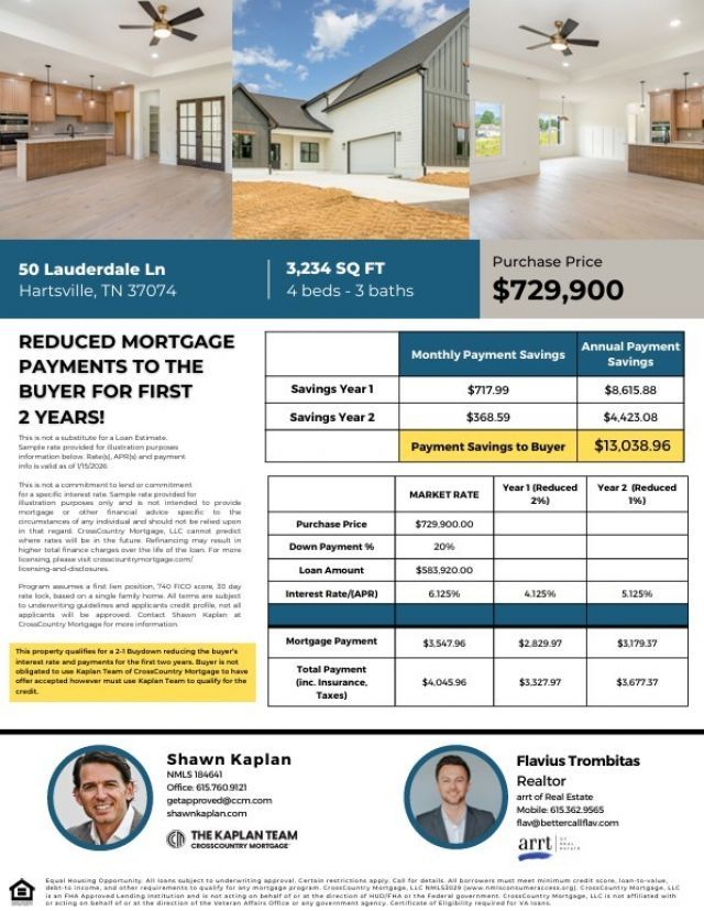 This single family home located at 50 Lauderdale Lane, Hartsville, TN 37074 is currently listed for sale with an asking price of $729,900. This property was built in 2026 and has 4 bedrooms and 3 full baths with 3234 sq. ft. Lauderdale Lane is located in the Helm subdivision. Search Helm real estate on online.fusion2b.com today.