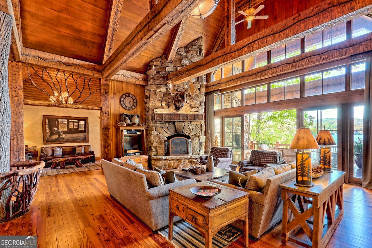 50 Point Morgan is a rare and extraordinary offering on one of Lake Burton's most coveted stretches, combining timeless craftsmanship, luxurious upgrades, and unforgettable views. Set against a backdrop of expansive open water and layered mountain vistas, this prestigious estate delivers the ultimate lakefront lifestyle. The authentic custom built home, situated on 2.15 lush acres, showcases exceptional attention to detail, featuring spectacular finishes, locally sourced real trees incorporated throughout, 4 masonry fireplaces, and extensive custom paint that creates warmth and character in every room. With 6+ bedrooms and 7 full and 2 half baths, the home is designed for both grand entertaining and comfortable multi-generational living. A stunning porte cochere entry welcomes you with a custom water fall, setting the tone for the craftsmanship found throughout. The massive lakeside screened porch is a true highlight---perfect for relaxing or entertaining while taking in the breathtaking views. The two-story, two-stall boathouse is equally impressive, offering easy access to deep, open water and serving as the perfect hub for lake days. Since purchasing in 2018, the current owners have thoughtfully enhanced the home with upgraded lighting, new wood flooring and ceilings downstairs, fresh custom paint throughout, and high-end furnishings and bedding, making this property truly turnkey. Designed with both luxury and fun in mind, the home includes incredible spaces for children, including a whimsical bunk room with its own private teddy bear room, a treehouse-inspired playroom, and a full-sized custom train room . . . features rarely found and unforgettable for guests of all ages. 50 Point Morgan is more than a home, it is a legacy property: a one-of-a-kind opportunity to own one of Lake Burton's most distinctive and prestigious estates.