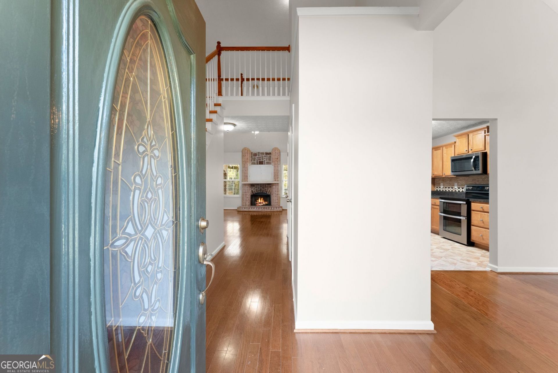 Welcome to this beautifully maintained home with standout curb appeal, featuring a full stone and brick exterior and a freshly painted interior throughout. Step inside to an impressive two-story foyer that opens to a vaulted dining space and a bright, inviting living room anchored by a custom stone fireplace. The kitchen offers an open, easy flow for everyday living and connects seamlessly to the backyard, making entertaining effortless. The owner's suite on the main level is spacious and serene with vaulted ceilings, plus an en suite bath featuring a soaking tub, separate shower, double vanity, and a walk-in closet. A convenient half bath is also located on the main level. Upstairs, you'll find additional bedrooms and a full bath, along with a large bonus room that offers flexible space for a playroom, media room, home office, or guest area. Outside is where this property truly shines. Enjoy a large, open backyard with custom stonework and walking paths, a covered patio, and an entertainer's dream setup complete with an outdoor fireplace and outdoor kitchen. There's also a fun fort-style storage building and a private pond feature, plus a gated path that connects directly to the community pond and field. With no neighbor on one side, added privacy, and a brick, hand-built perimeter fence surrounding the property, this home offers a rare combination of space, function, and lifestyle.